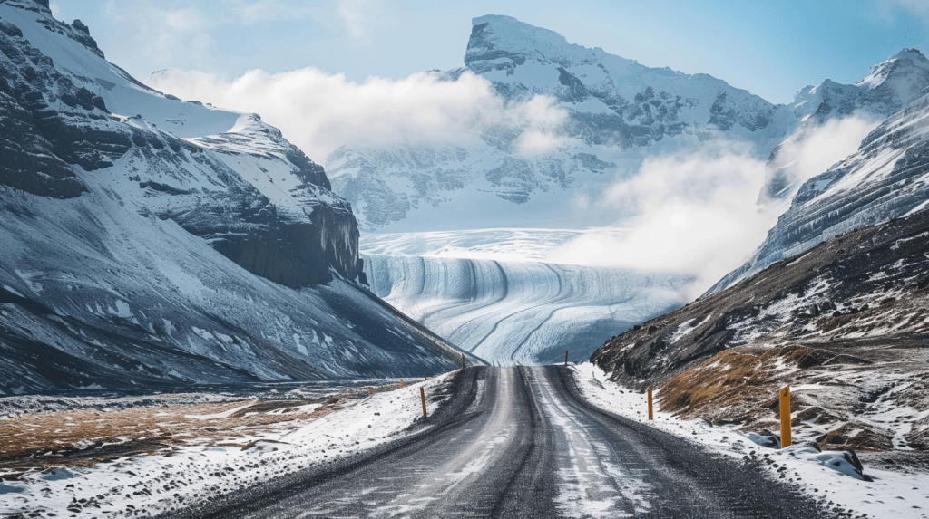 As they continue their journey, the road begins to climb higher into the mountains, offering stunning views of the glacier as it comes into clearer focus. The anticipation builds as they approach their destination, eager to explore one of Iceland’s most awe-inspiring natural wonders.
