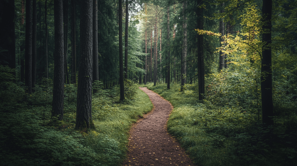 Emma and Marta wander through the ancient Białowieża Forest, the sun filtering through the dense canopy of trees, creating dappled patterns on the forest floor. The air is fresh, filled with the scent of earth and leaves.