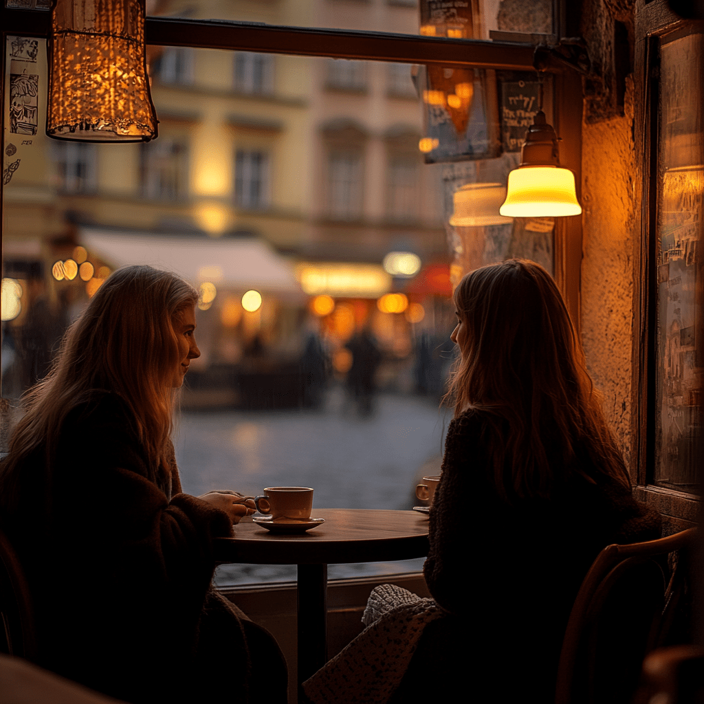 (她們在一家小咖啡館停下,坐下來點了咖啡。氣氛平靜而祥和,與過去的動盪形成鮮明對比。)