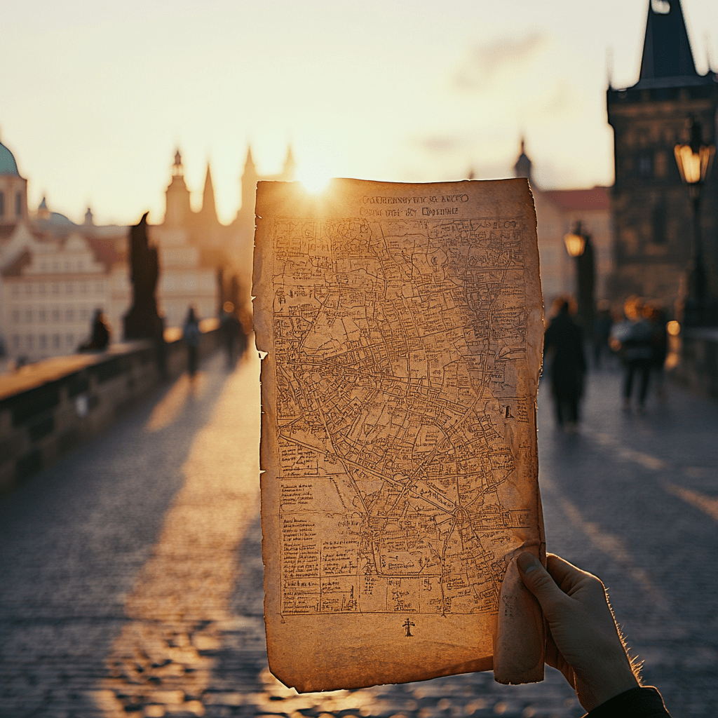 (As they unroll the parchment, they find a detailed map of Charles Bridge, marked with several symbols and notes in Latin. It appears to be a guide to finding specific points on the bridge that align with celestial events.)