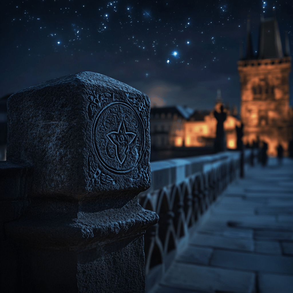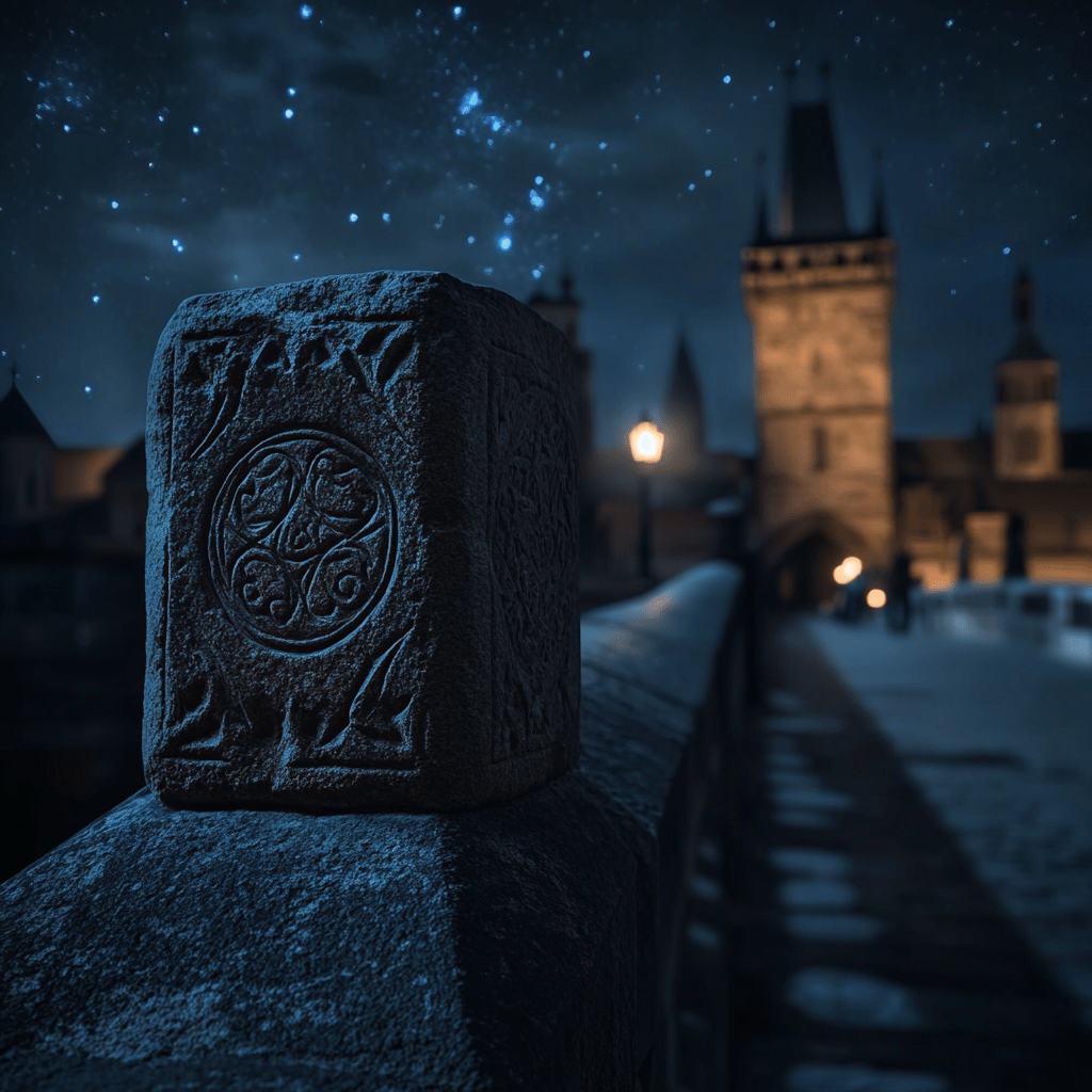 (The girls are standing at the ancient stone on Charles Bridge, examining the worn symbol closely. The sun is setting, casting long shadows over the bridge, and the city begins to quiet down.)