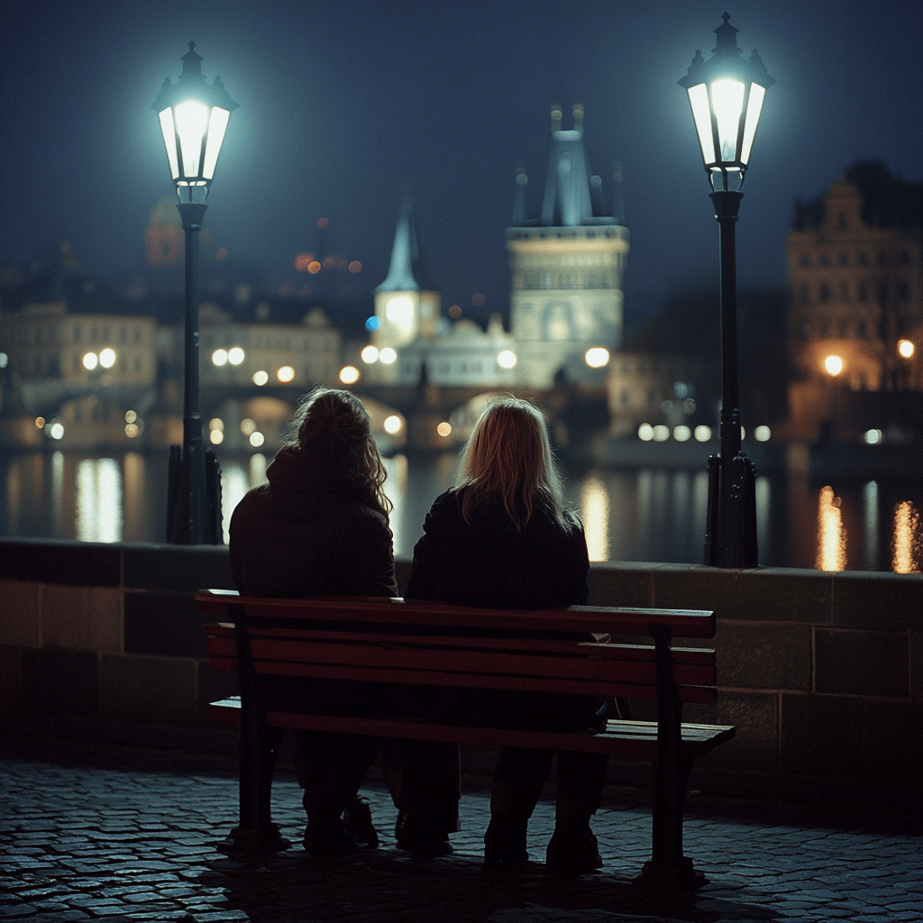 (在查理大橋上的激烈經歷之後,愛麗絲和艾瑪決定坐下來反思她們所學到的一切。她們坐在一個俯瞰伏爾塔瓦河的長凳上,遠處現代布拉格的燈光閃爍。)