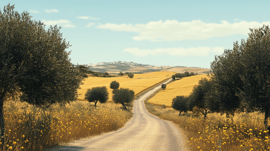 They packed their things into the car, and soon they were driving down the winding country roads, the landscape slowly shifting from olive groves to more rugged terrain. The sun climbed higher in the sky, casting long shadows over the fields.