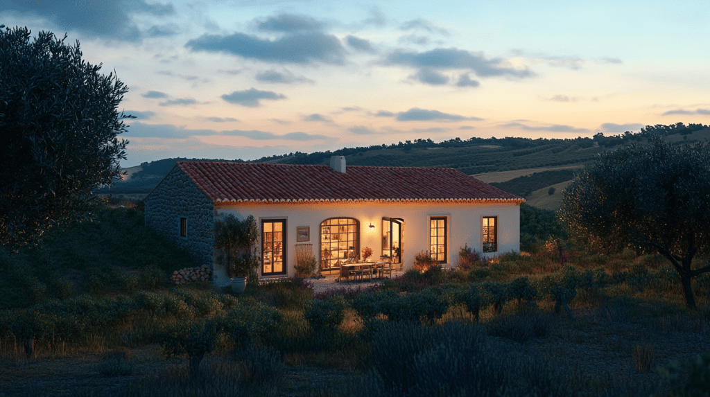 她們繞過一個彎道,一座傳統的阿連特茹農舍出現在眼前。這是一座簡單但充滿魅力的石造建築,刷白的牆面和陶土色的屋頂顯得格外溫馨。廚房的窗戶透出溫暖的燈光,照亮了庭院,烤魚和新鮮麵包的香氣飄散在空氣中。