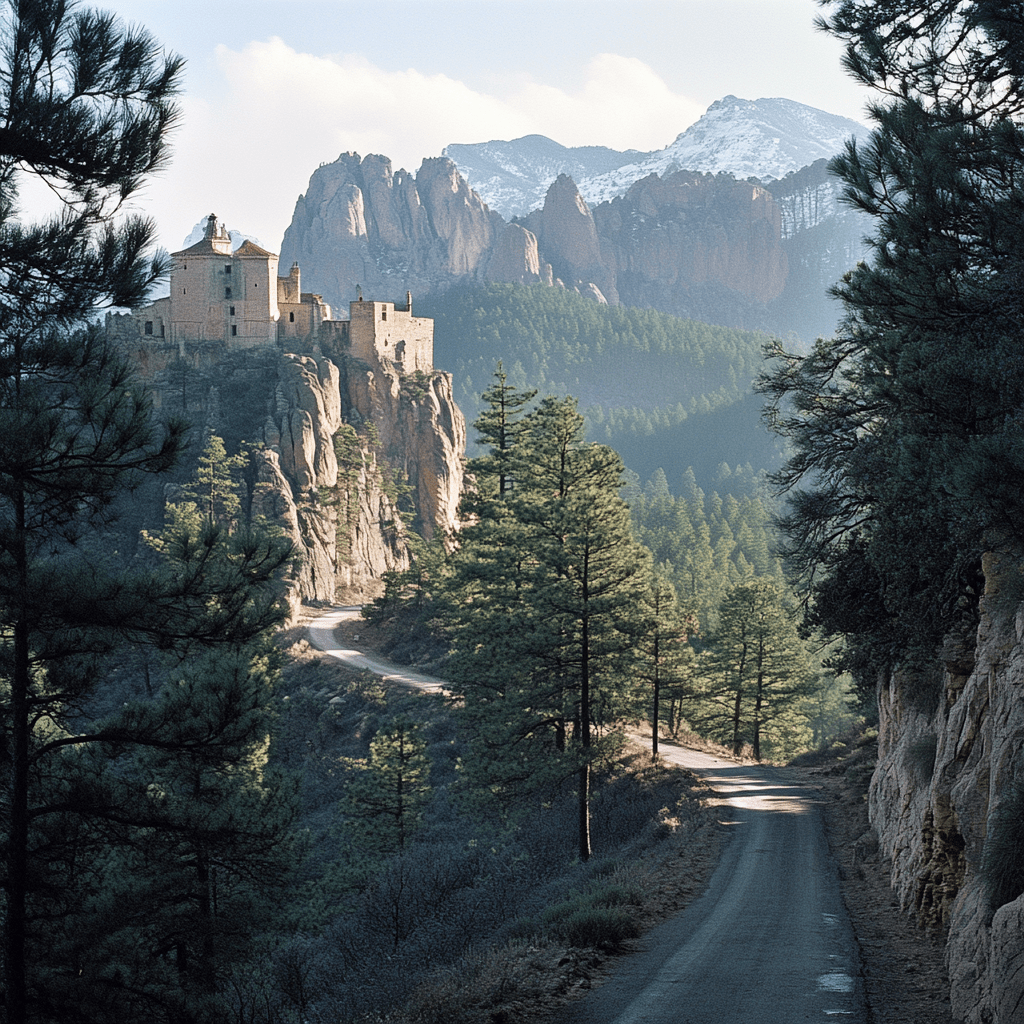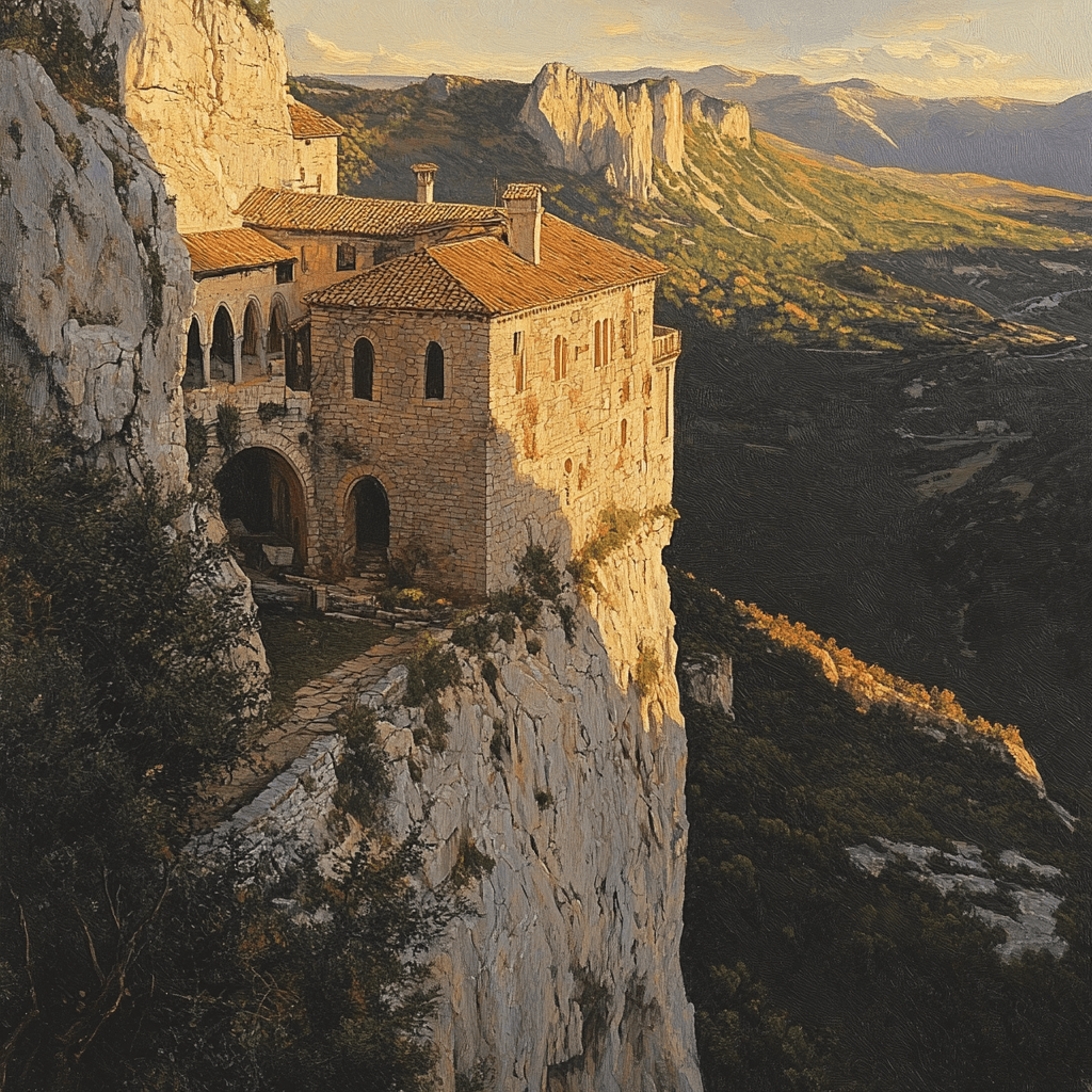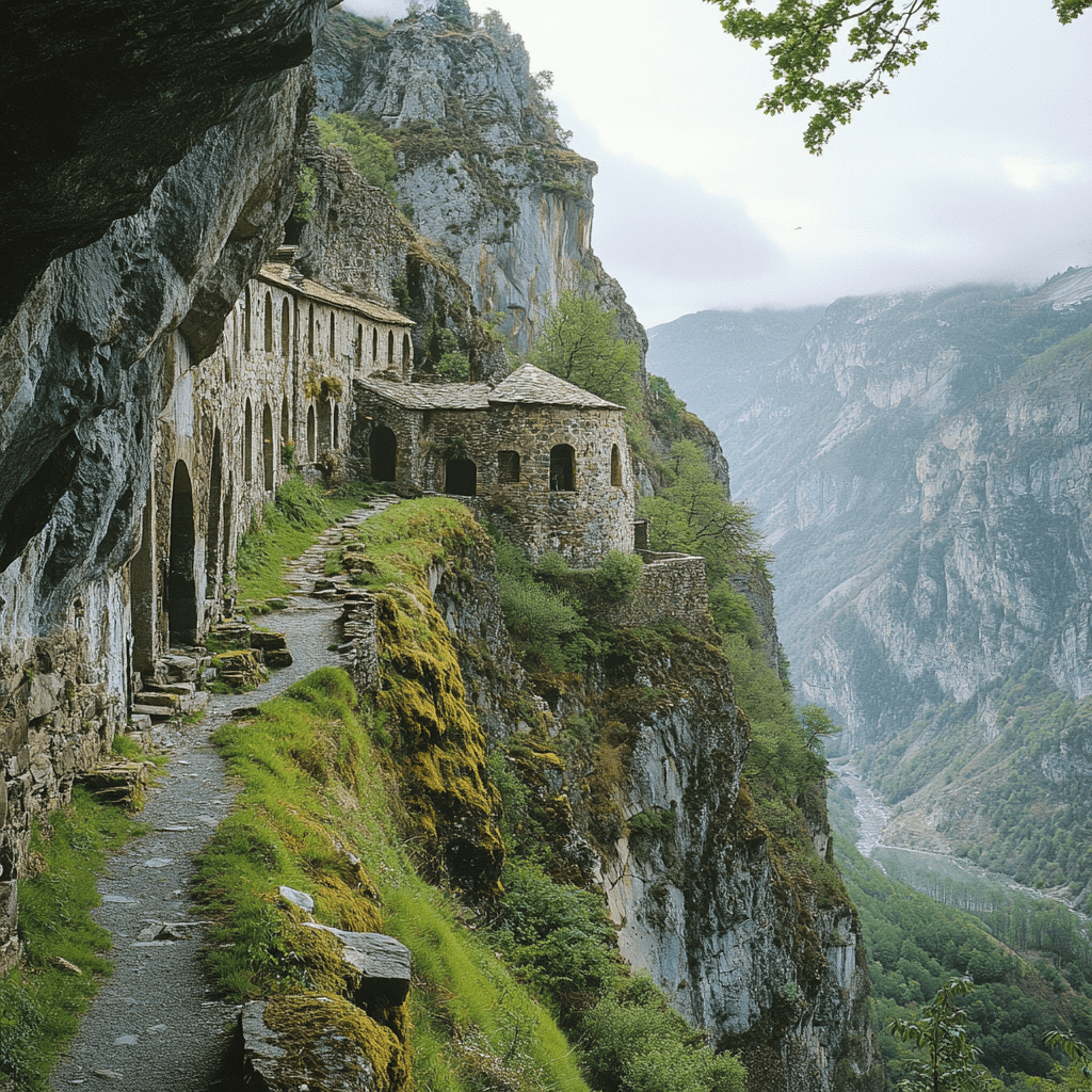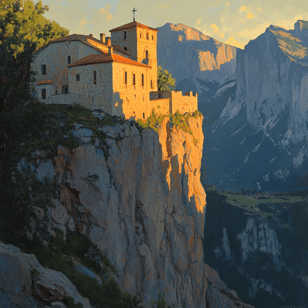 (They park the car and stand at the monastery’s entrance, overlooking the valley below. The breeze carries the scent of pine trees, and the majestic Pyrenean peaks stand tall in the distance.)