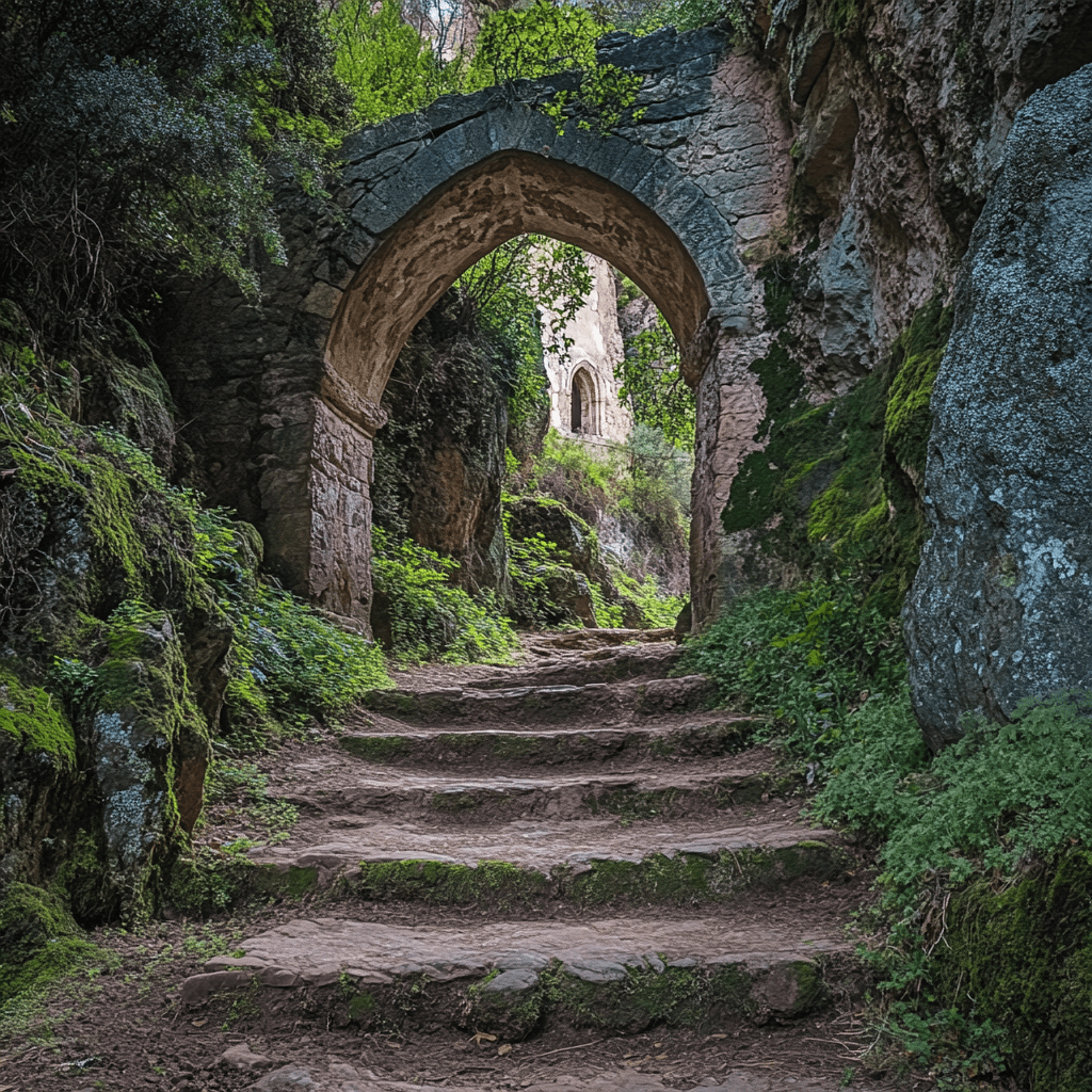 (背景:她們走進修道院,石牆上刻著數世紀的痕跡,微弱的光線透過小窗戶照射進來,營造出莊嚴的氛圍。空氣中瀰漫著歷史的厚重感,彷彿僧侶和國王的聲音依然迴響在這裡。)