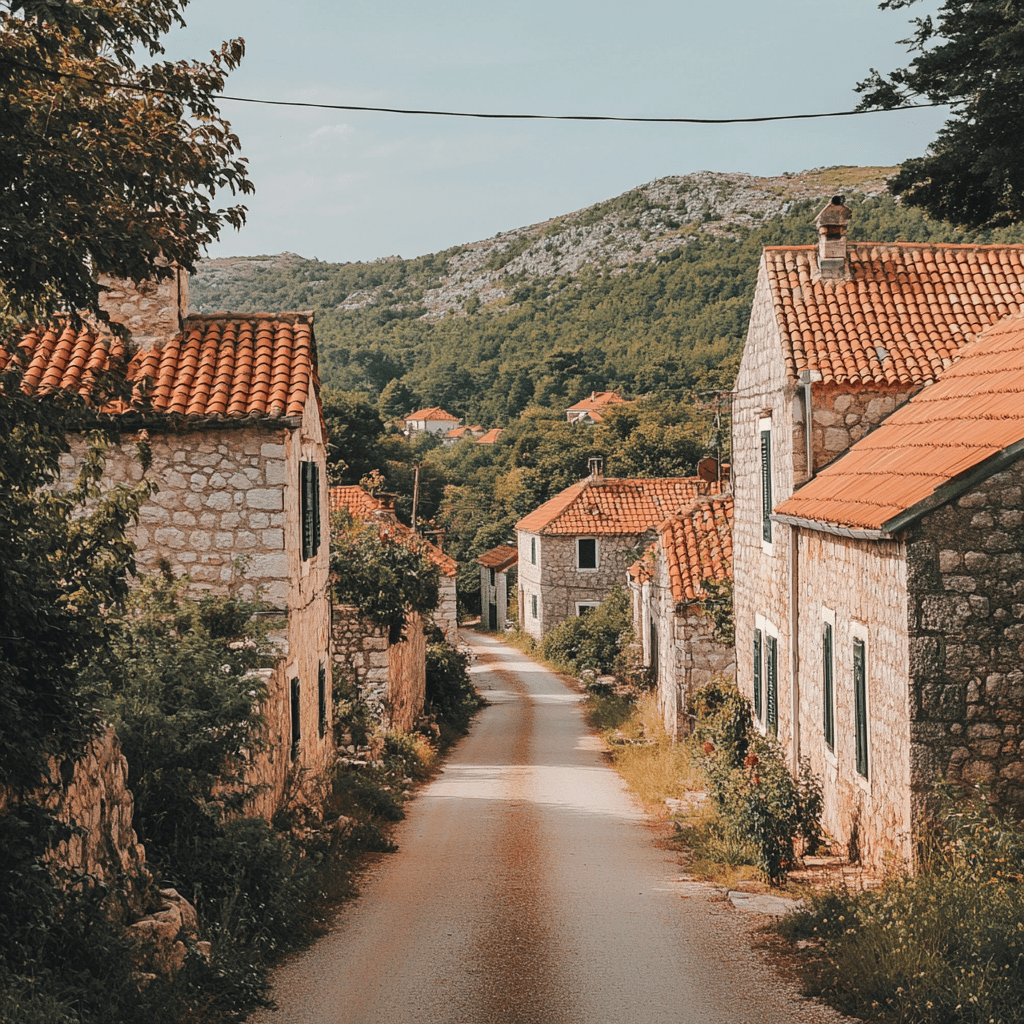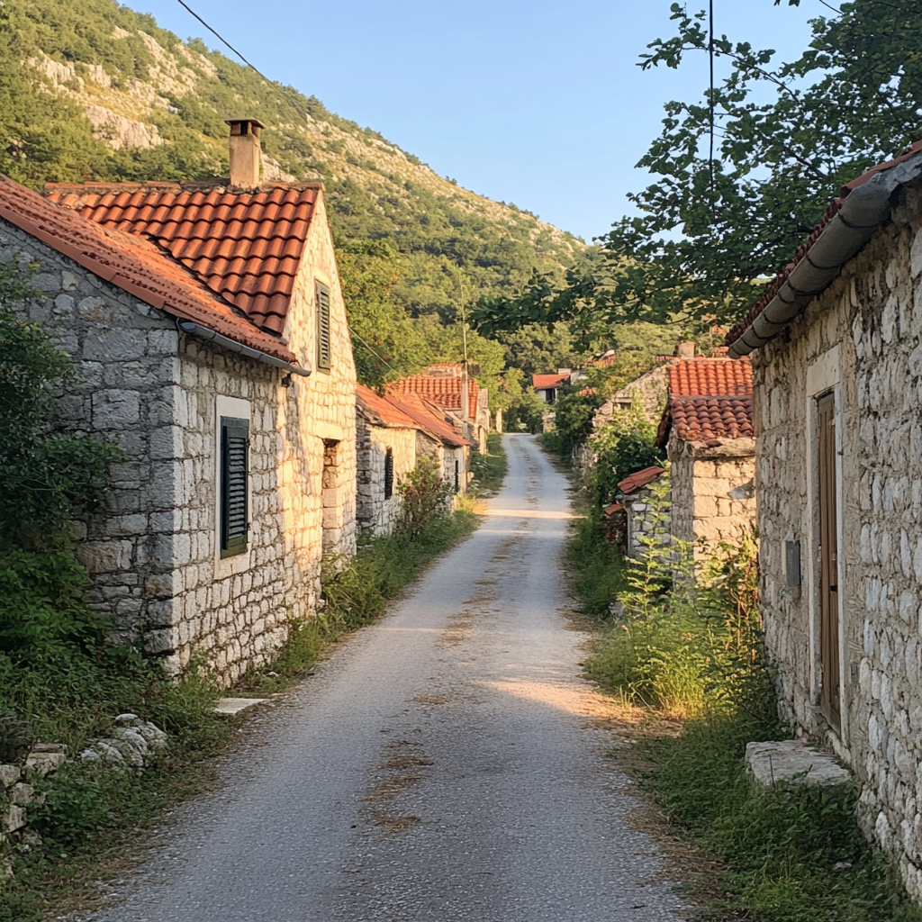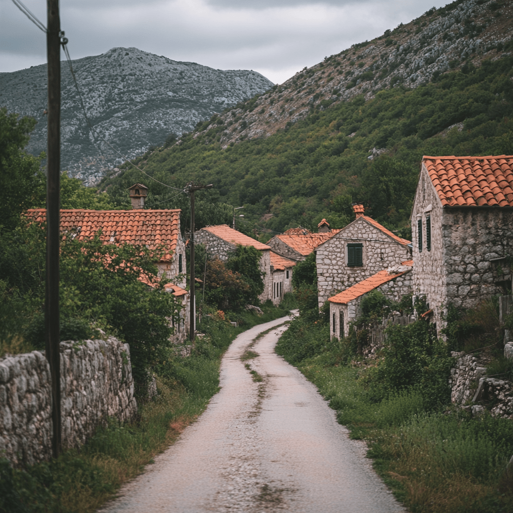 (她們沿著蜿蜒的道路行駛,亞得里亞海的景象逐漸消失在後視鏡中,前方是高聳的山脈。地形變得更加崎嶇,河流蜿蜒穿過山谷。小村莊點綴在山間,紅瓦屋頂在灰綠色的山脈中顯得格外顯眼。)