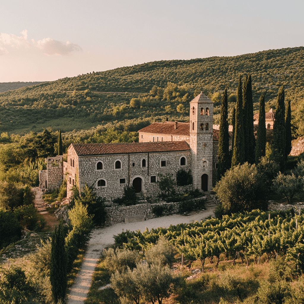 (They spend time walking around the monastery grounds, the sound of the river accompanying their reflections. Afterward, they drive towards Žitomislić Monastery, located deeper inland, surrounded by olive trees and vineyards.)