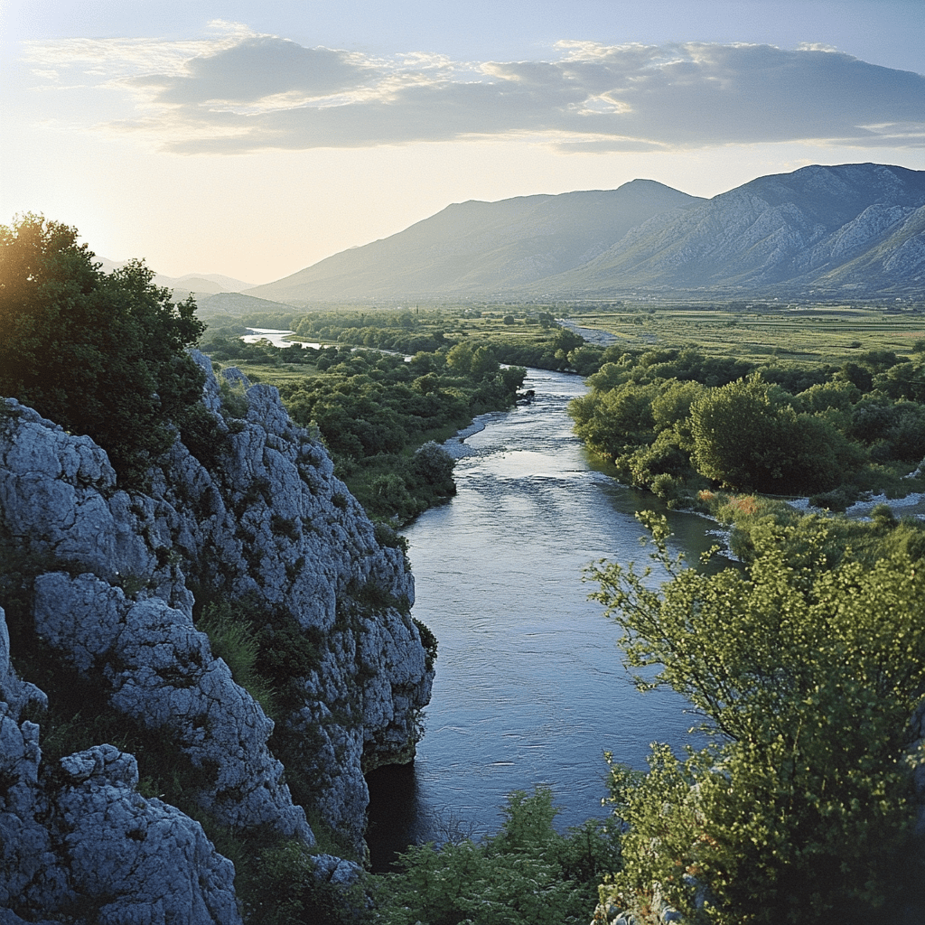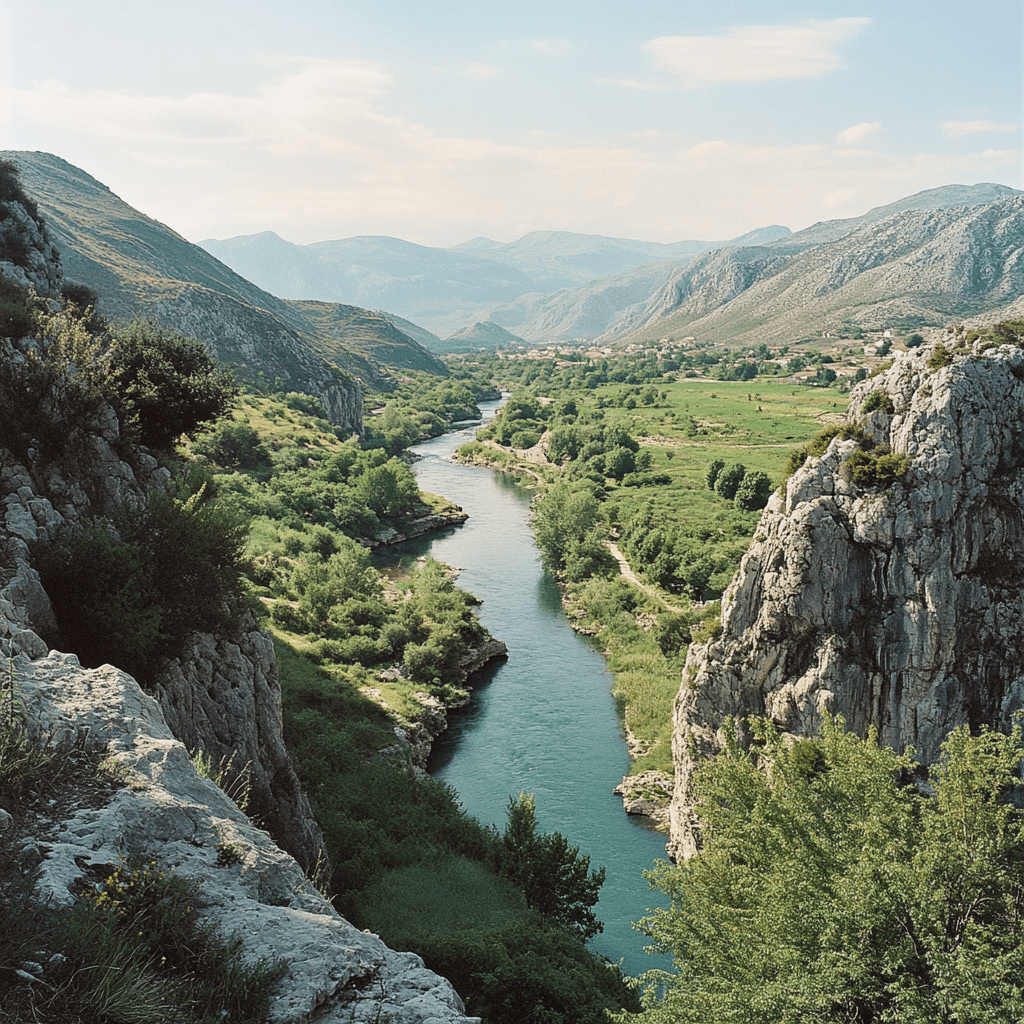 (As they drive closer to Mostar, the rugged mountains surrounding the valley begin to appear, contrasting sharply with the lush greenery of the Neretva River below.)