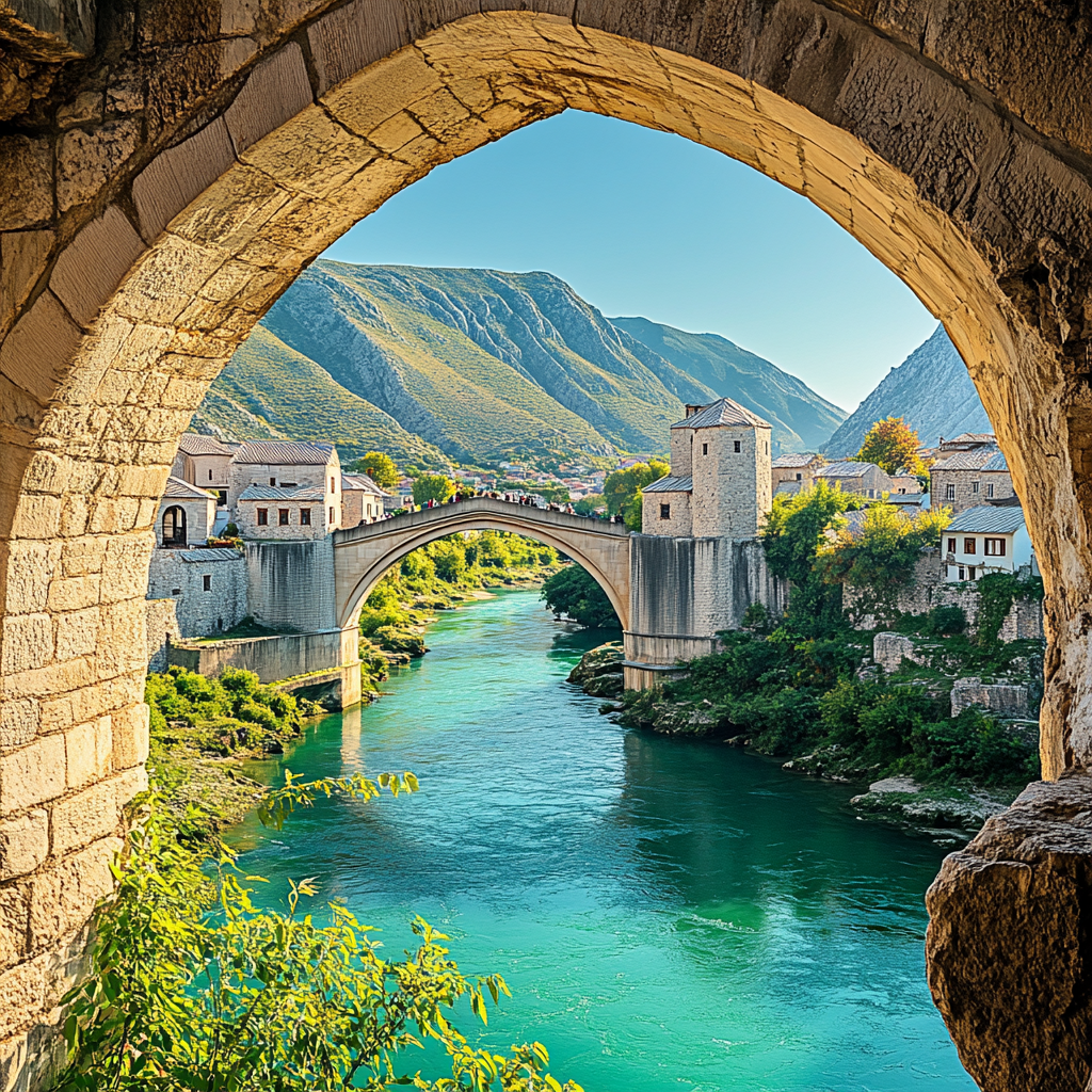 (They finally arrive at the base of the Stari Most bridge, its graceful arch rising above the Neretva River. The sound of the rushing water below echoes through the stone streets.)