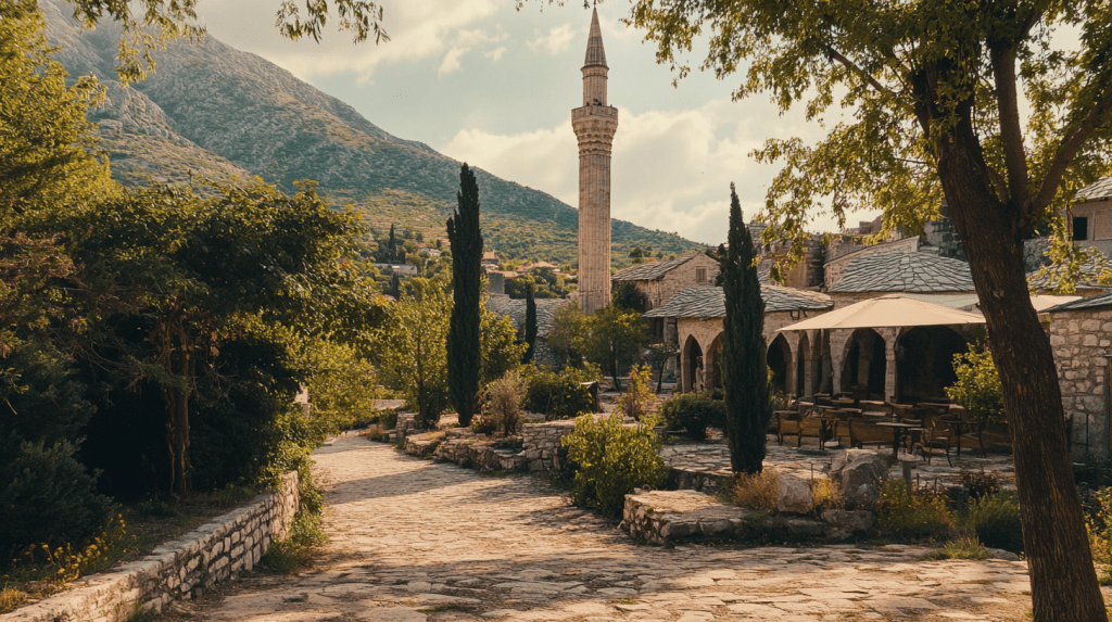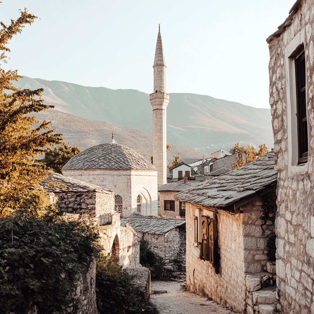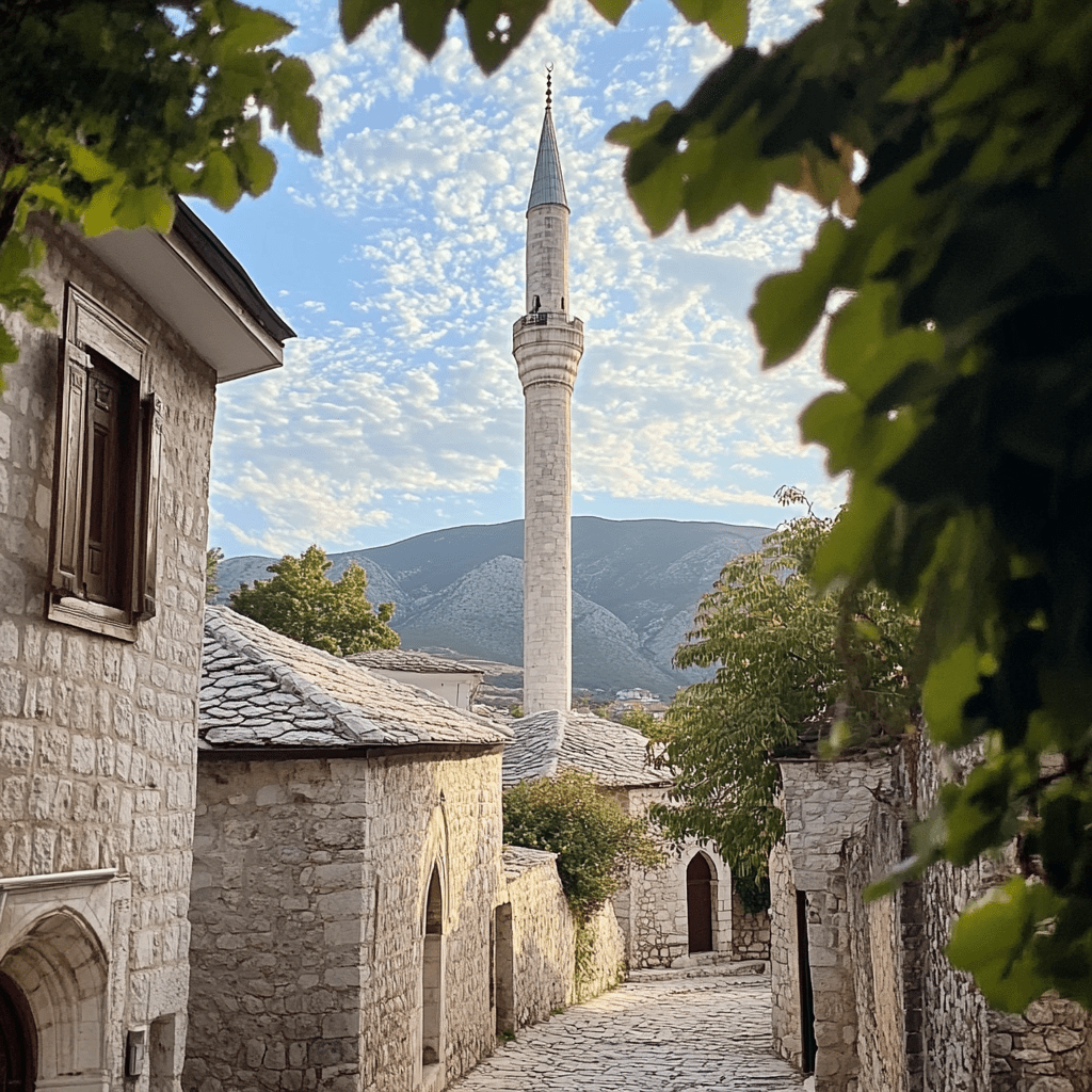 (Clara and Isabel continue their journey through Mostar, walking towards the Koski Mehmed Pasha Mosque after visiting the Stari Most. The old town’s cobblestone streets wind around them, and the vibrant mix of Ottoman and European influences is evident in every building they pass.)