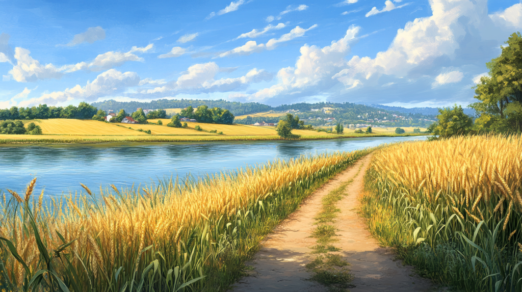 結束市場的參觀後,Sophia 和 Clara 沿著一條小徑來到多瑙河邊,找了一個安靜的地方坐下,欣賞河流與鄉村景色。兩人繼續剛才在市場中的話題,自然地聊著生活細節。