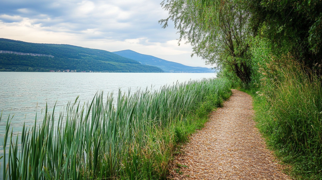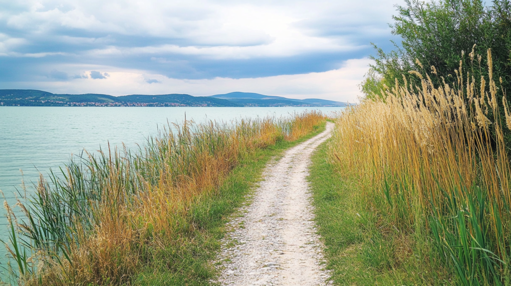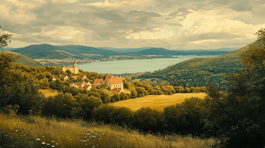 Sophia and Clara arrive at the Tihany Peninsula’s observation platform, gazing over the stunning Lake Balaton and the surrounding landscape. The volcanic terrain of the peninsula is clearly visible under the sunlight, sparking a conversation about the geological history of the area and its significance in Hungary’s past.