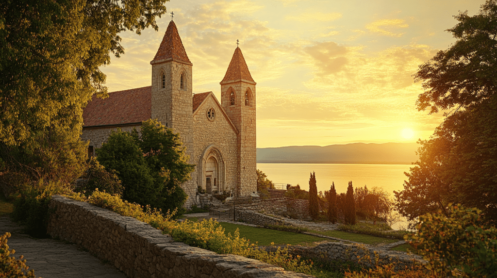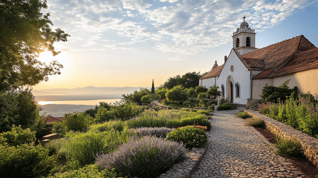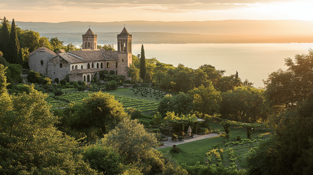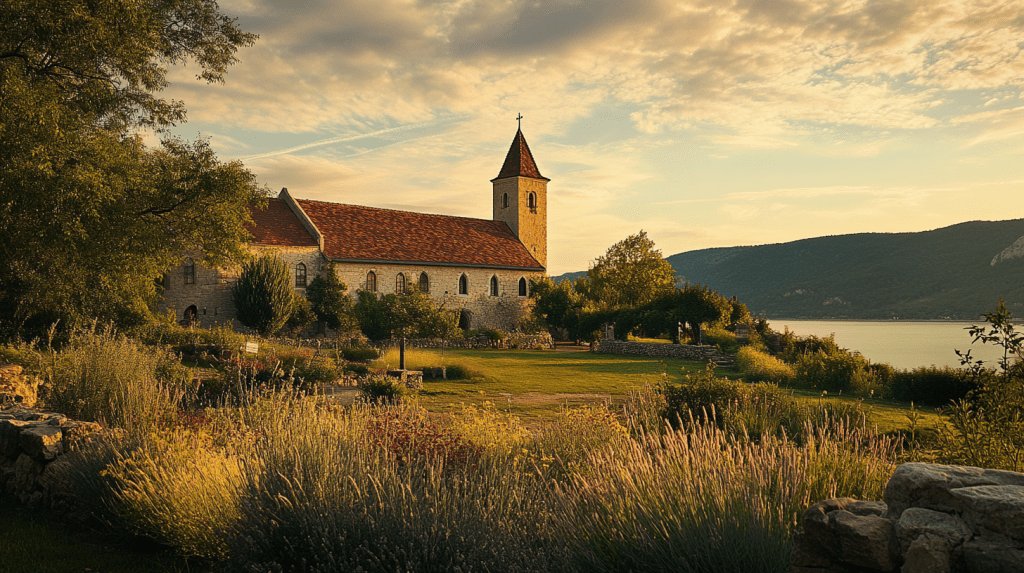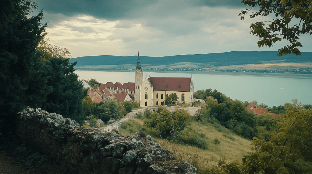 Sophia and Clara continue their stroll along the Tihany Peninsula and arrive at the famous Tihany Abbey. This medieval abbey is perched on the high point of the peninsula, offering a view of the entire Lake Balaton. The two pause to admire the abbey’s majestic architecture and begin a conversation about its historical significance.