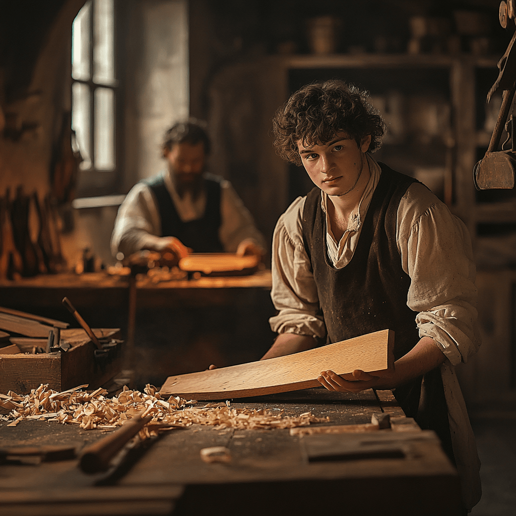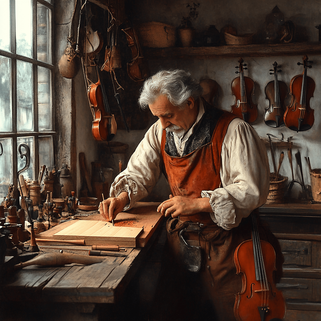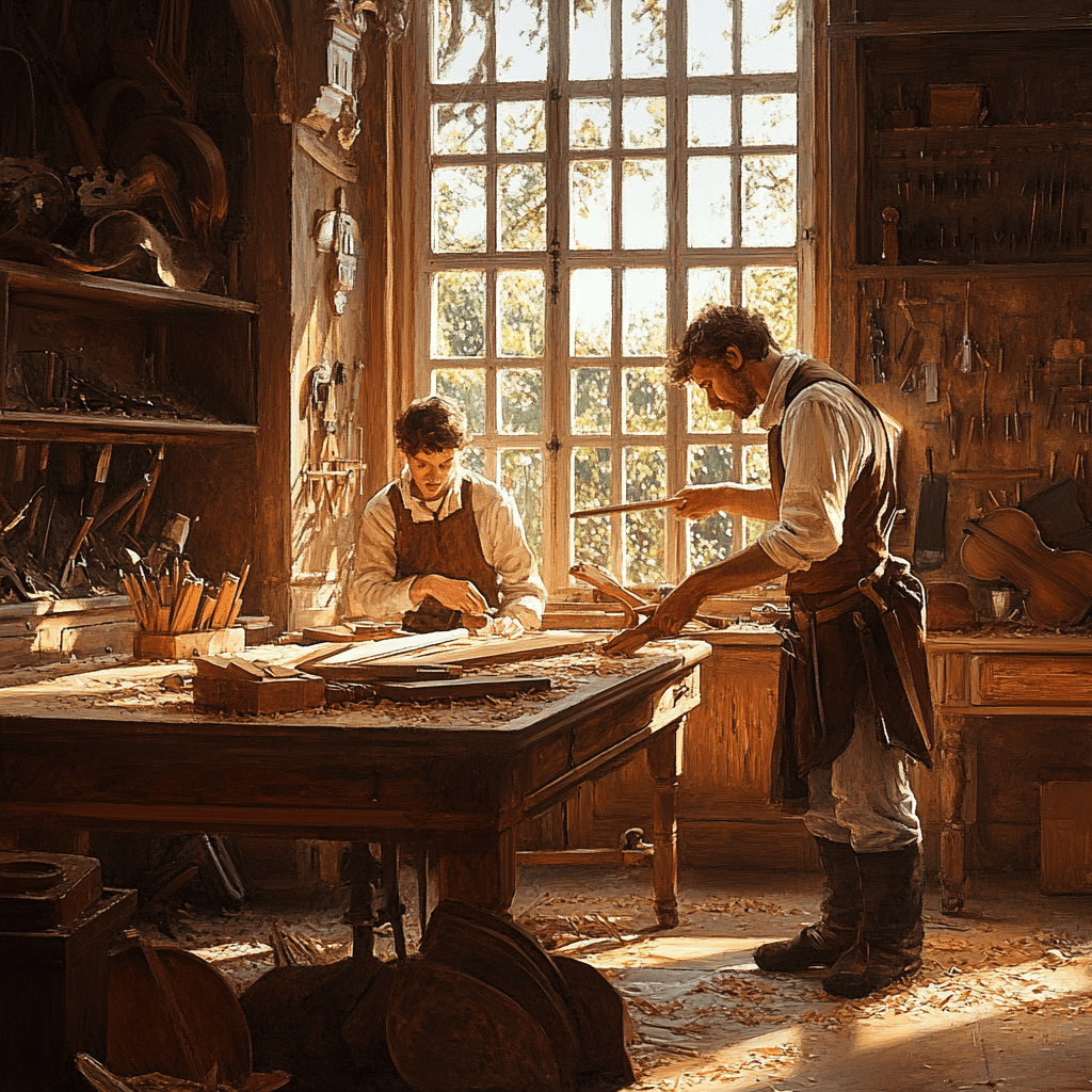 清晨的陽光穿過高高的窗戶,灑在滿是工具的木製工作台上——鑿子、刨子和雕刻刀四處散落。安東尼奧·斯特拉迪瓦里站在一張巨大的橡木桌旁,仔細檢查一塊剛切好的雲杉木。他的學徒馬泰奧站在一旁,一個瘦削、滿臉渴望的十六歲男孩,專注地盯著老師的動作。
