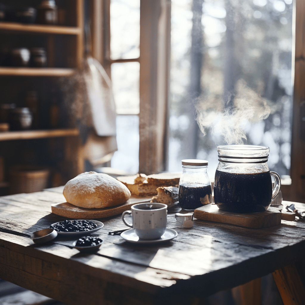 餐桌上擺滿了豐盛的菜餚:馴鹿燉肉、烤根莖蔬菜和一條深色的黑麥麵包。一小碗越橘果醬放在正中央,鮮紅的顏色在餐桌的樸實色調中格外顯眼。茱莉亞將熱騰騰的雲莓茶倒進簡約的陶瓷杯中,蒸氣懶散地升起。