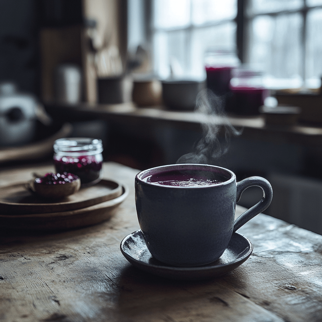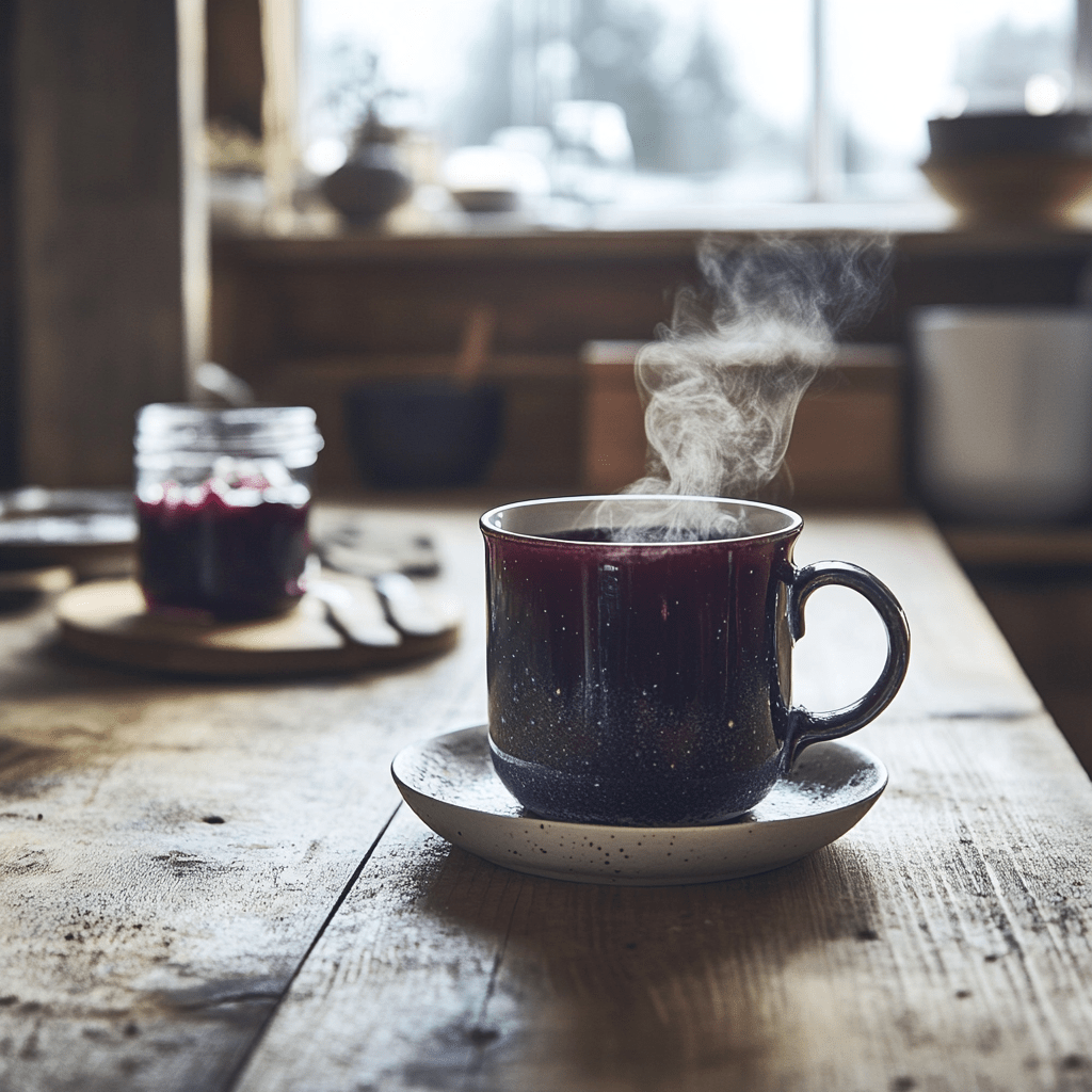 Julia walked over with two steaming mugs of dark red liquid. “Here, blueberry juice. It’s a Finnish winter favorite.”