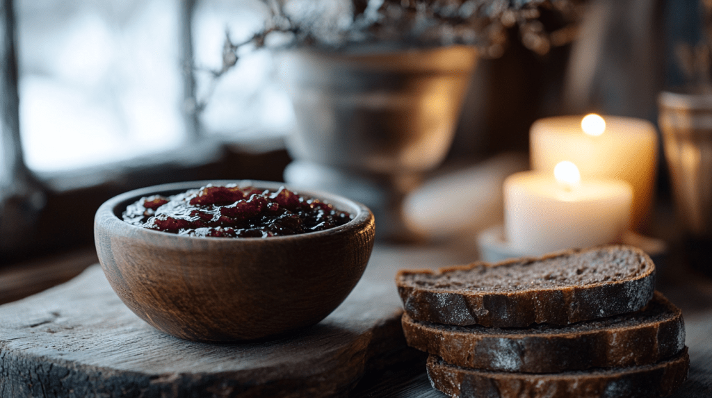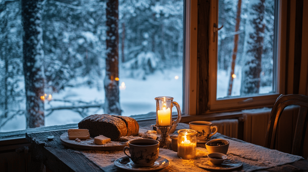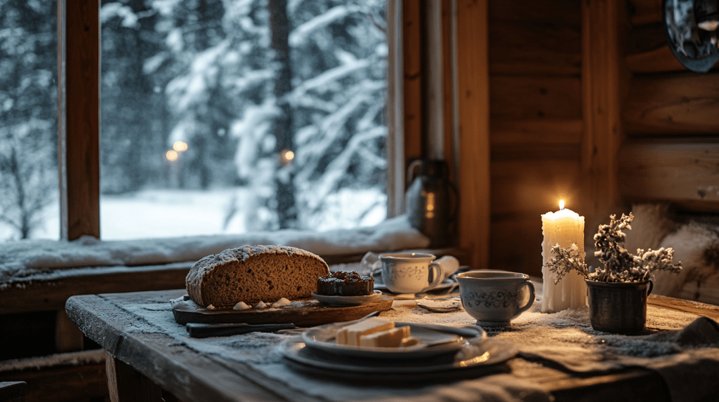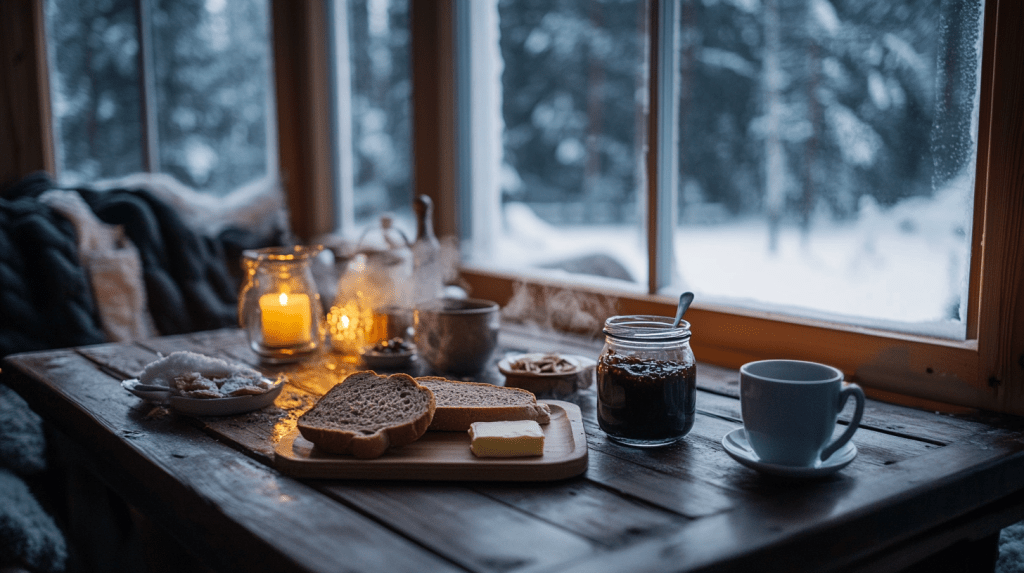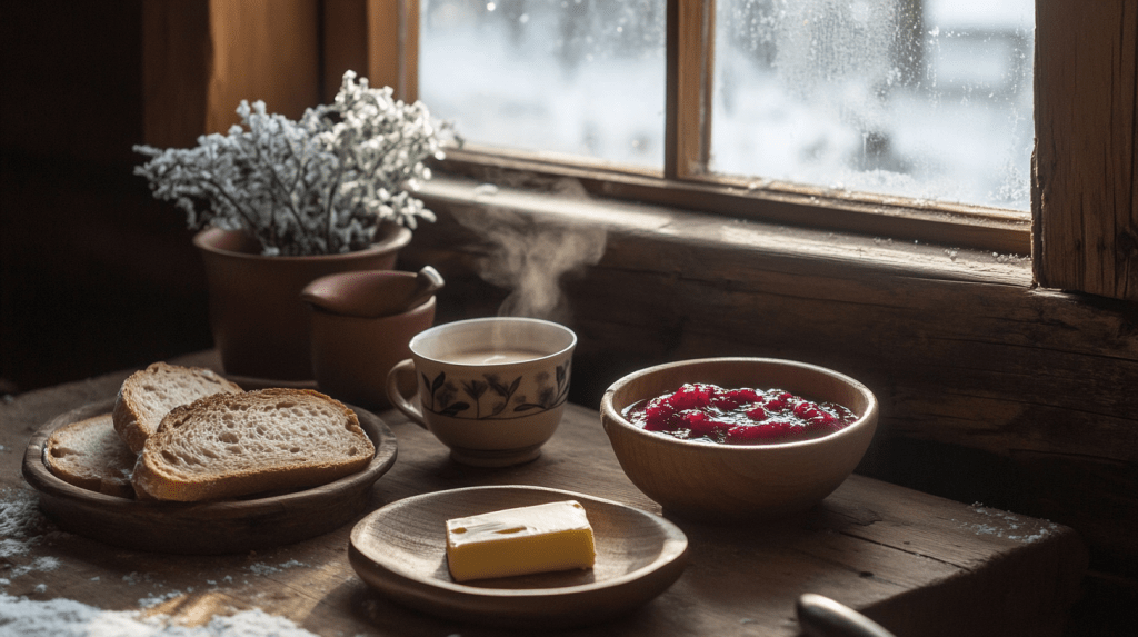 The morning sunlight filtered faintly through the frosty windows as Emma and Julia sat at the wooden dining table, sharing a simple but hearty breakfast. The table was set with slices of dark rye bread, creamy butter, a jar of cloudberry jam, and two steaming mugs of coffee.