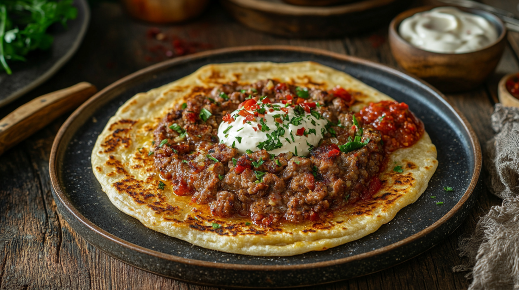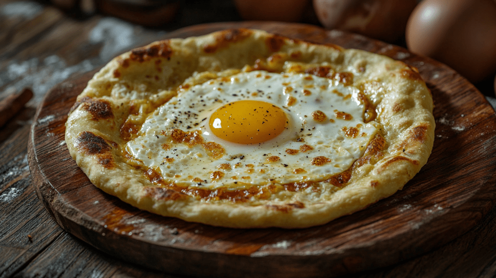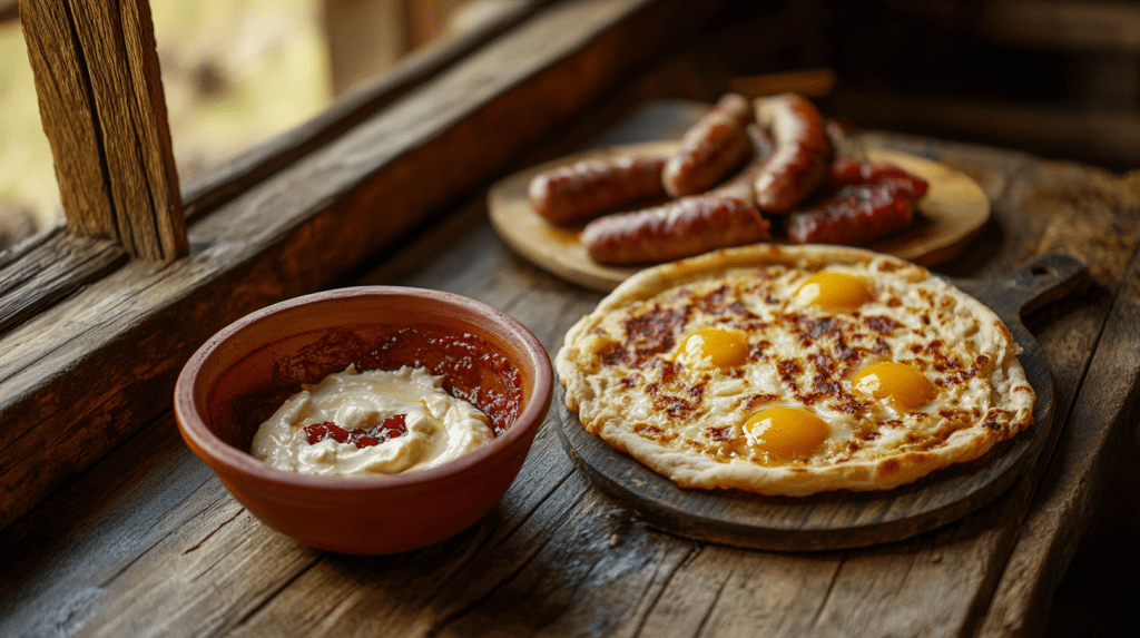 Serbian breakfast: a small clay bowl of fresh kajmak (creamy fermented dairy spread), warm lepinja flatbread with a golden, crispy crust, homemade plum jam with a deep purple hue, alongside grilled Serbian sausages and fluffy scrambled eggs.