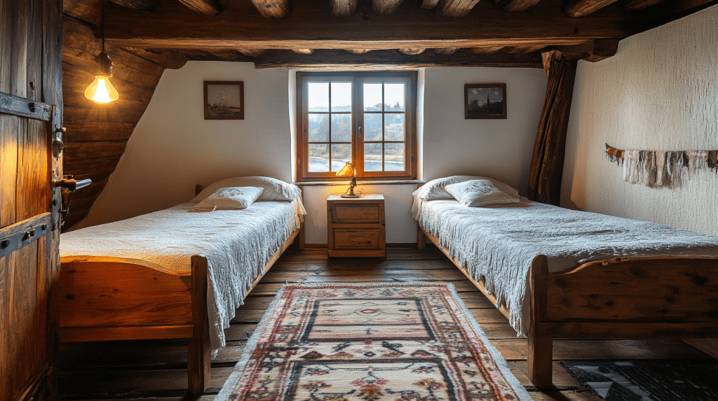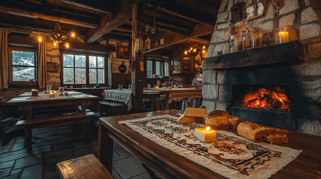 晨光透過旅館的小窗戶,灑在簡單的木桌上。Emma 和 Julia 坐在角落,享受著寧靜的早餐時光。窗外,西莫拉瓦河在陽光下閃爍著粼粼波光,谷地中仍殘留一絲晨霧。空氣中瀰漫著新鮮咖啡、剛出爐的麵包,以及淡淡的蜂蜜香氣。桌上擺著塞爾維亞傳統早餐:溫熱的 lepinja(扁平麵包)、新鮮的 kajmak(發酵奶油)、自製的梅子果醬,以及香腸與炒蛋。