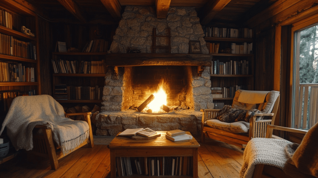 壁爐裡的火焰緩緩燃燒,木柴發出細微的噼啪聲。屋內溫暖舒適,與窗外寒冷的山間空氣形成鮮明對比。Emma 伸出雙手取暖,接著歪了歪頭,像是發現了什麼。