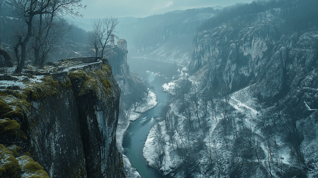 The road narrows as Emma and Julia enter the Ovčar-Kablar Gorge. Towering cliffs rise on either side, their rocky faces streaked with moss and small shrubs. The Western Morava River winds below them, its surface shimmering with soft reflections of the pale morning sky. In the distance, thin wisps of steam rise from the ground, signaling the presence of natural thermal springs. Scattered among the hills, small Orthodox monasteries cling to the slopes, their domed roofs barely visible through the trees.
