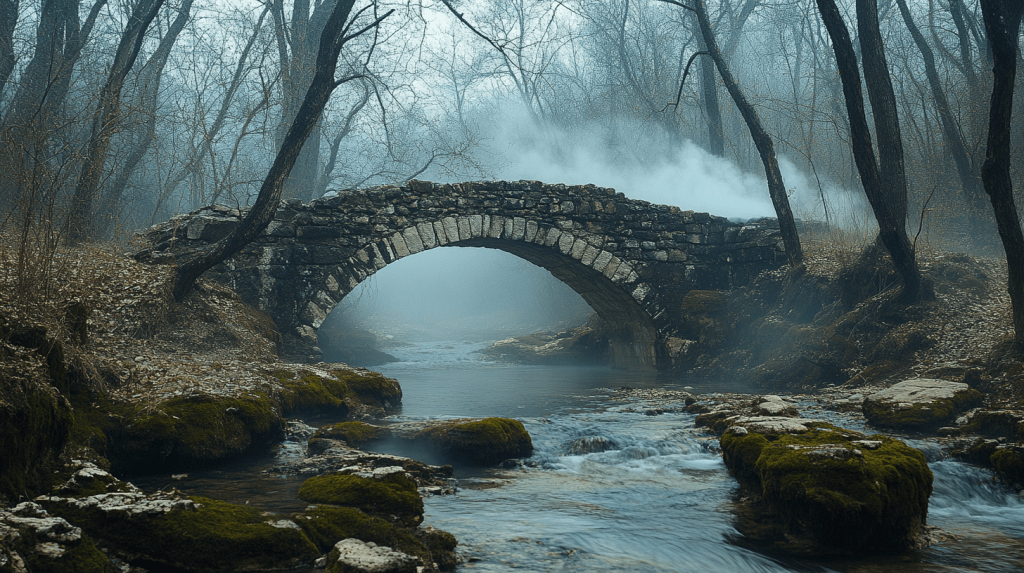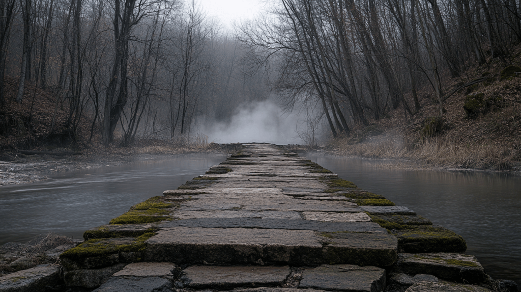 她們經過一個木製指示牌,上面寫著「Манастир Свете Тројице」(聖三一修道院)。小路蜿蜒向下,通往河邊,一座小石橋橫跨水面。遠處,溫泉的蒸汽與晨霧交織,為峽谷增添了一種神秘的氛圍。