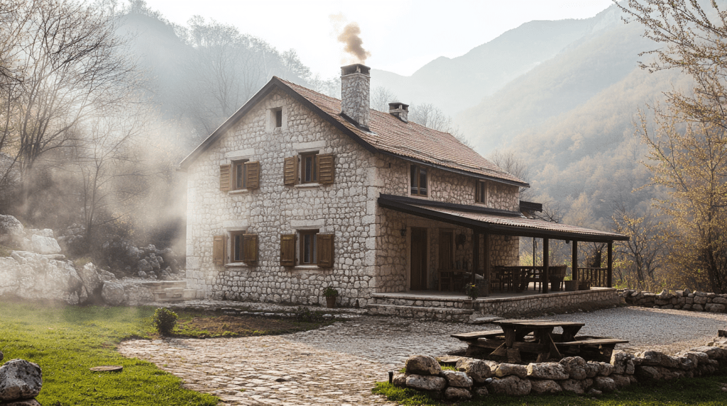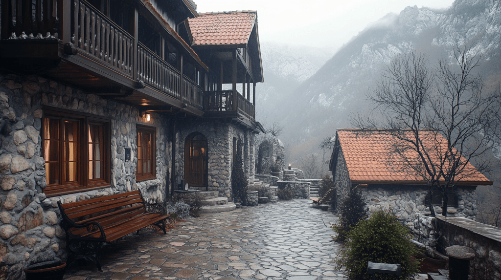 The sun has set behind the cliffs of the Ovčar-Kablar Gorge, casting a soft twilight over the valley. Emma and Julia have arrived at the small spa town of Ovčar Banja (Овчар Бања), nestled between the river and the steep mountains. The air carries the scent of damp earth, wood smoke, and distant hints of herbs from the kitchen of a rustic guesthouse where they plan to stay for the night. The building, with its thick stone walls, wooden balconies, and blue-painted shutters, feels like it has stood there for centuries.