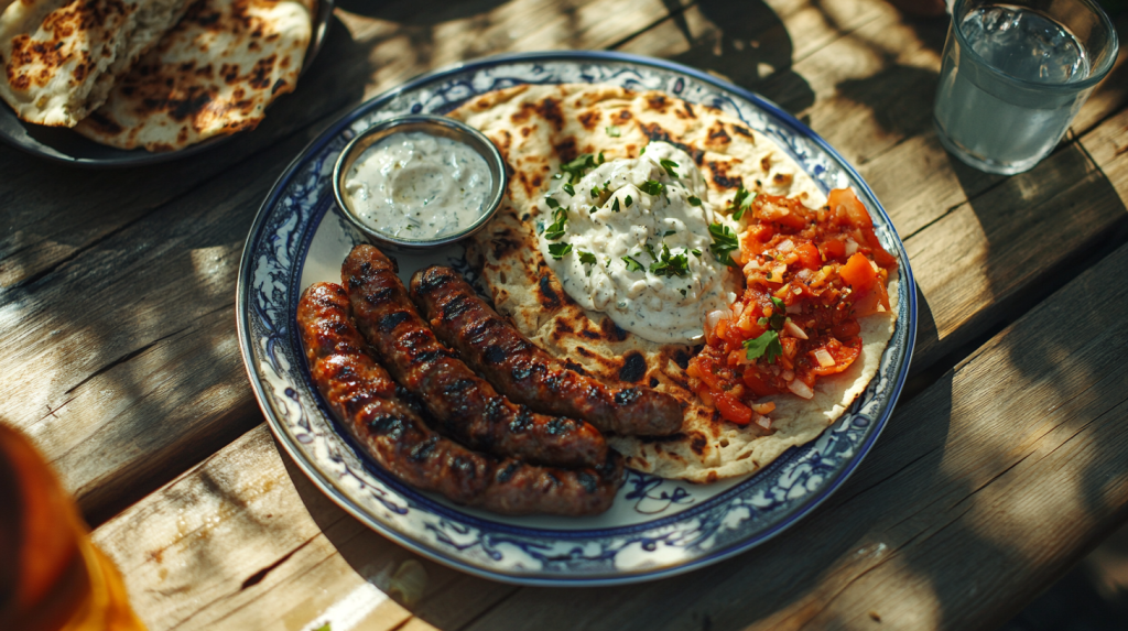 傳統塞爾維亞早餐:一小碗 新鮮的 Kajmak(濃郁的發酵奶油抹醬)、溫熱的 Lepinja 扁平麵包,外皮金黃酥脆、自製的 梅子果醬,色澤深紫,搭配 烤製的塞爾維亞香腸 和 鬆軟的炒蛋。