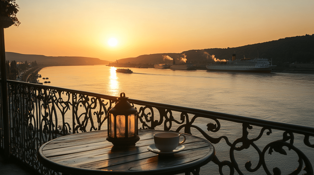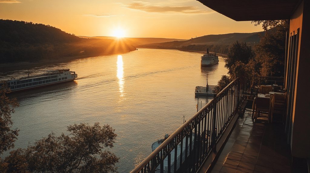 Emma and Julia sit on the balcony of their hotel in Galați, watching the Danube flow quietly at dusk. In the distance, a cargo ship slowly makes its way toward the Black Sea, its reflection shimmering on the water.