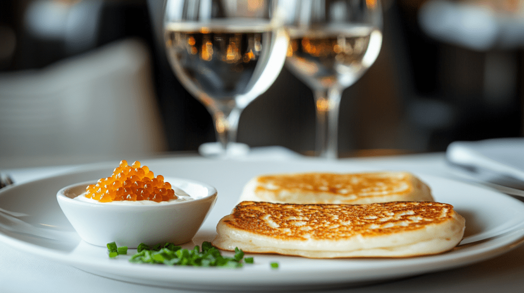 小薄餅(Blinis)搭配法式酸奶油(crème fraîche)與鱘魚魚子醬