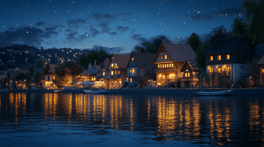 (晚餐後,她們來到陽台,望著夜色中的多瑙河,燈光閃爍,靜謐而深邃。)