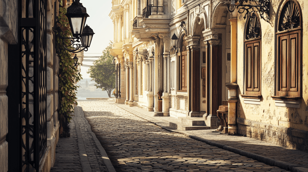 (Emma and Julia arrive in Brăila, walking through the cobblestone streets of the old town. The city retains traces of its Ottoman past, with a blend of neoclassical and oriental architectural styles.)