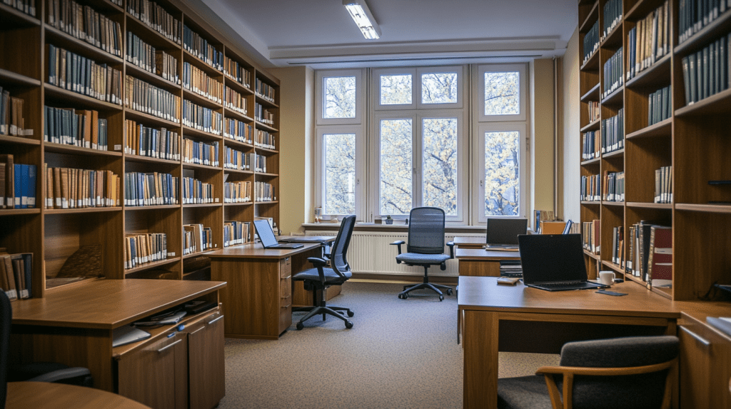 Her office was at the end of a quiet hallway, a shared workspace with several other scholars. Bookshelves lined the walls, already filled with academic volumes, while the desks were equipped with computers—indicating that research here was not confined to dusty archives but integrated with modern digital tools.