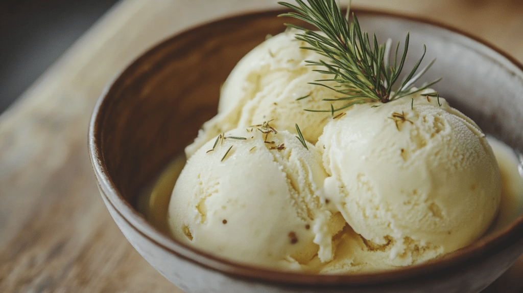 Artisan pine needle and honey flavored ice cream served in a handmade ceramic bowl.