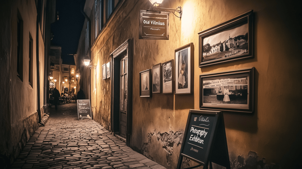 On their way back to the apartment, they passed a café with a gallery wall outside. It was hosting a small exhibit titled “Old Vilnius.”