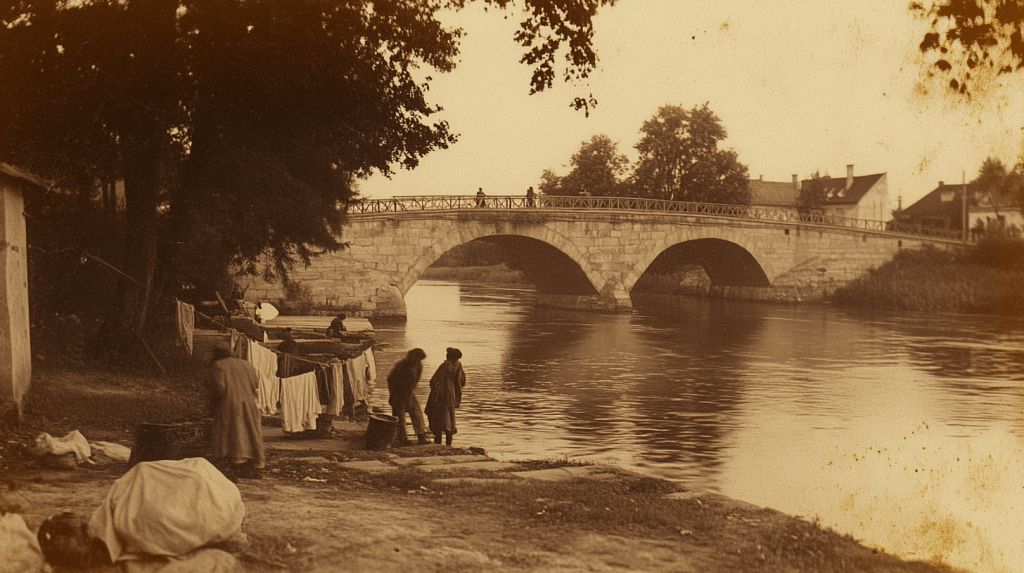 Emma paused to look. One sepia-toned photo showed women washing clothes by the river, with the same bridge they’d crossed earlier faintly visible in the background.