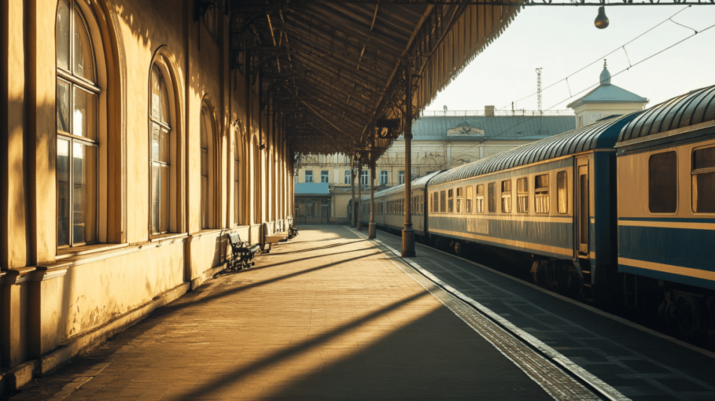 Julia 和 Emma 在早上八點左右抵達維爾紐斯火車站。這座老車站有著淡黃色的外牆與高高的拱形窗戶,清晨的光線讓整座建築顯得格外沉靜。站台上只有零星幾位乘客,捧著紙杯喝著熱咖啡,在微涼的空氣中吐著白霧。