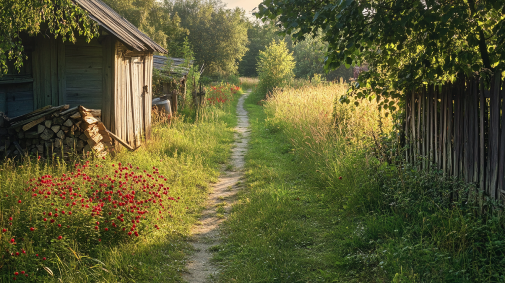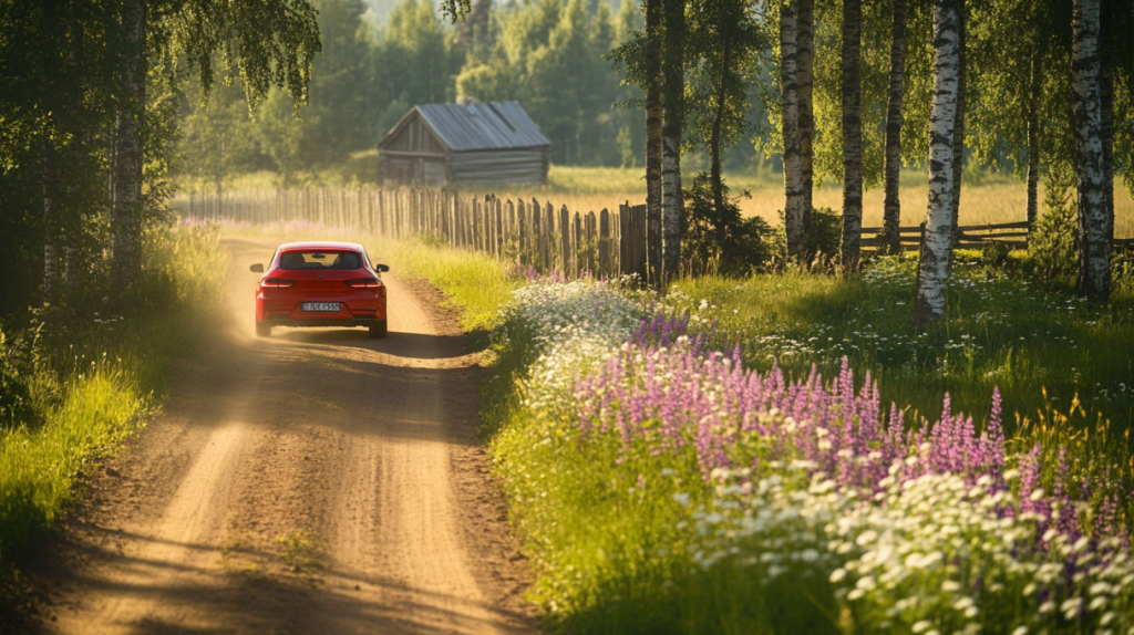 They passed patches of pine and birch trees shimmering in the sunlight. On the side of the road, lupines bloomed in bursts of purple, while small white daisies and yellow tansy swayed in the breeze. Further along, they drove past a wooden fence enclosing a field of blooming wildflowers, with smoke curling lazily from the chimney of a small farmhouse beyond.