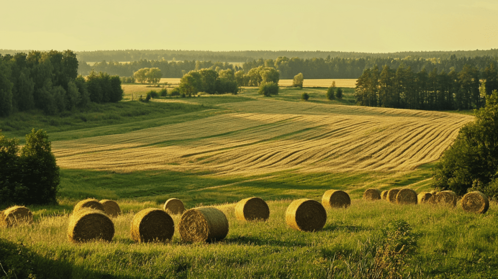周圍的鄉村風景靜靜地延展出去,金黃色的乾草捆散落在田野間,林邊則是一排排細長的樹。空氣溫暖,帶著草香與太陽曬過泥土的味道。