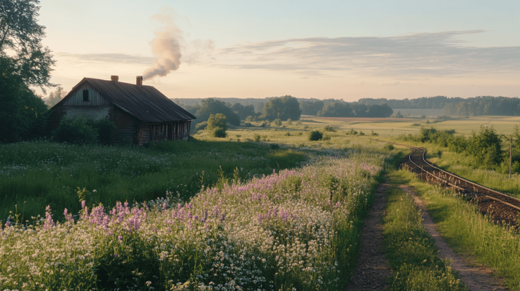 Out one side, there were glimpses of distant farmhouses with steep roofs and smoke curling up from chimneys. On the other, wildflowers bloomed along the tracks—purple lupines, yellow tansy, and small white blossoms Emma didn’t recognize.