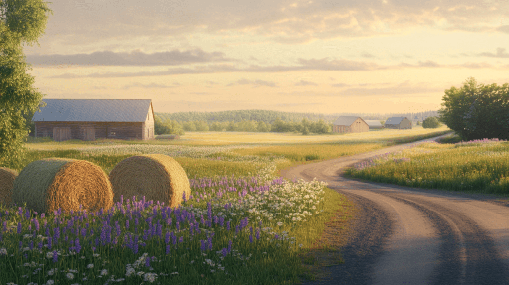 The countryside around them stretched quietly in all directions, dotted with hay bales and thin clusters of trees. The air was warm, scented faintly of grass and sun-warmed soil.