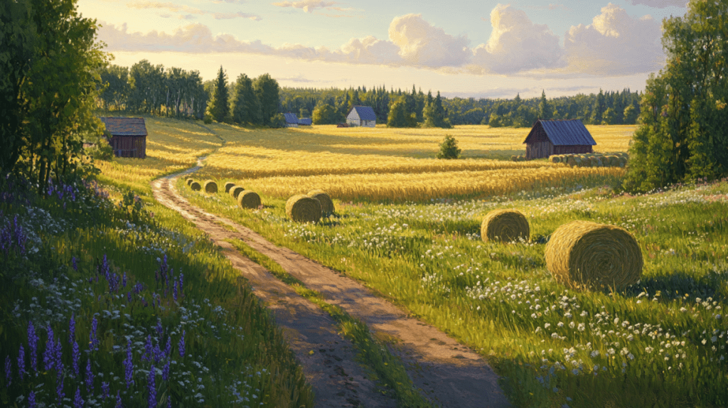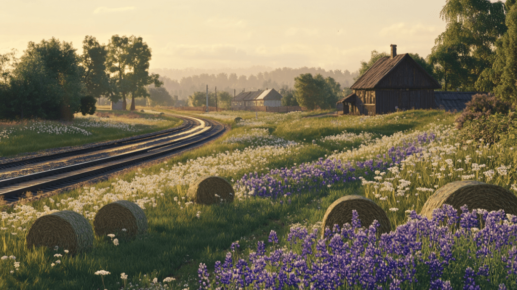 郊區逐漸展開,一望無際的田野上散落著圓形的乾草捆,小片的松樹與白樺樹林在陽光下閃著銀綠色的光。火車偶爾停靠在鄉間小站,站台只是長椅與一個木造遮棚,有些還漆著藍色或紅色。