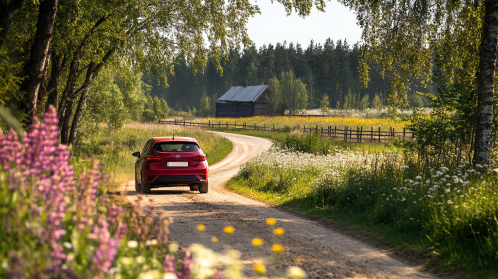 Just as the train pulled away from the platform, a red car turned onto the dirt road near the station, kicking up a gentle swirl of dust. It was an old hatchback—practical and well-used, with one door painted a slightly different shade than the rest.