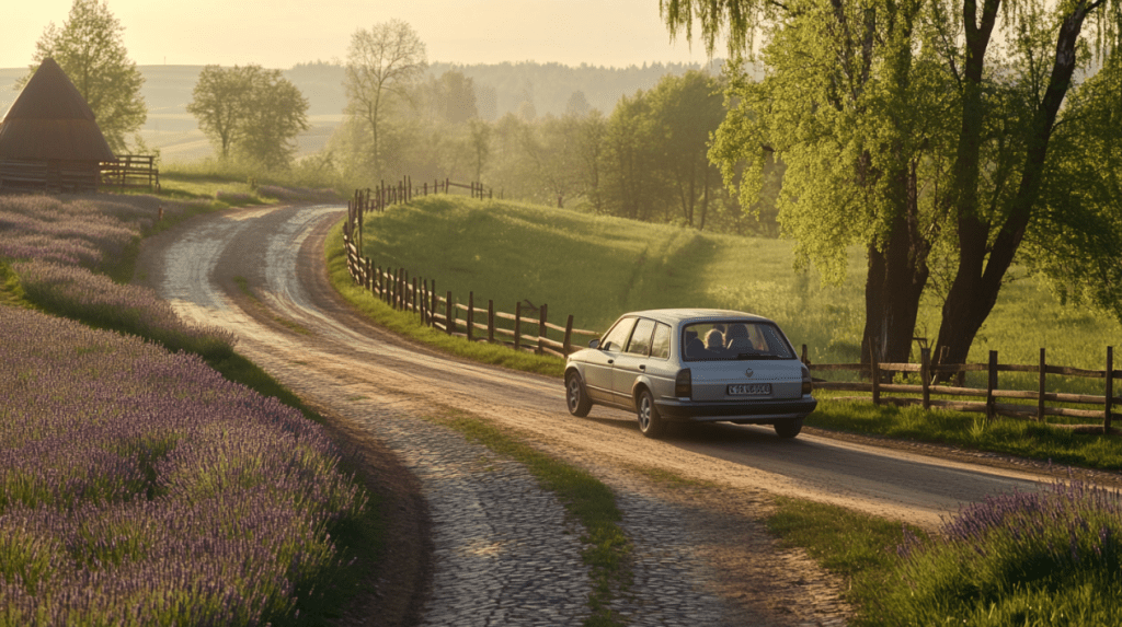 The transition from city to countryside was subtle but steady. Cracked sidewalks turned into gravel shoulders, and the buildings became fewer, their facades worn but quietly dignified.
