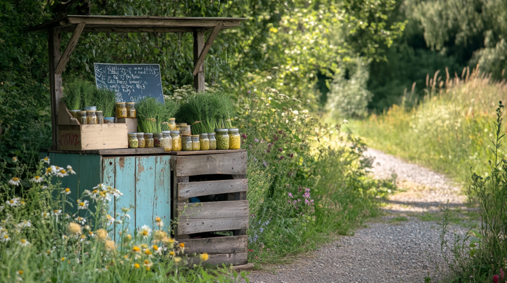 Small garden plots flanked some homes, bordered by low wooden fences with early lavender already in bloom. They passed a small roadside stand selling bundles of dill and jars of pickled beets; no one was manning it, just a tin box for coins and a handwritten sign.