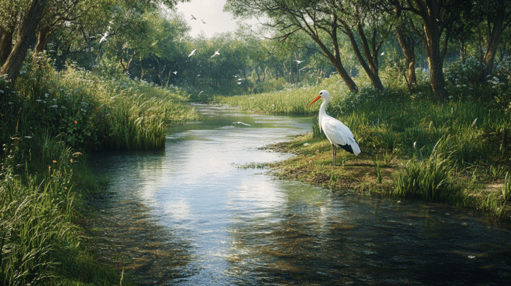 A long stretch of fields opened up beside them. Golden-green and rippling in the light wind, the land looked half-asleep. Hay bales dotted the distance like punctuation marks. Birds skimmed the tips of the grass, and a lone stork stood in the shallows of a narrow stream.