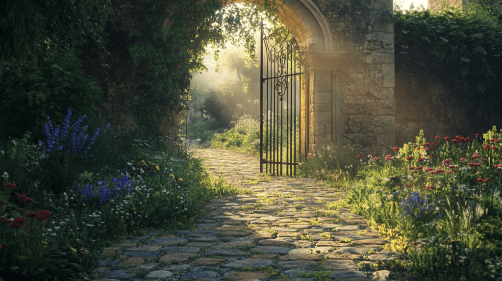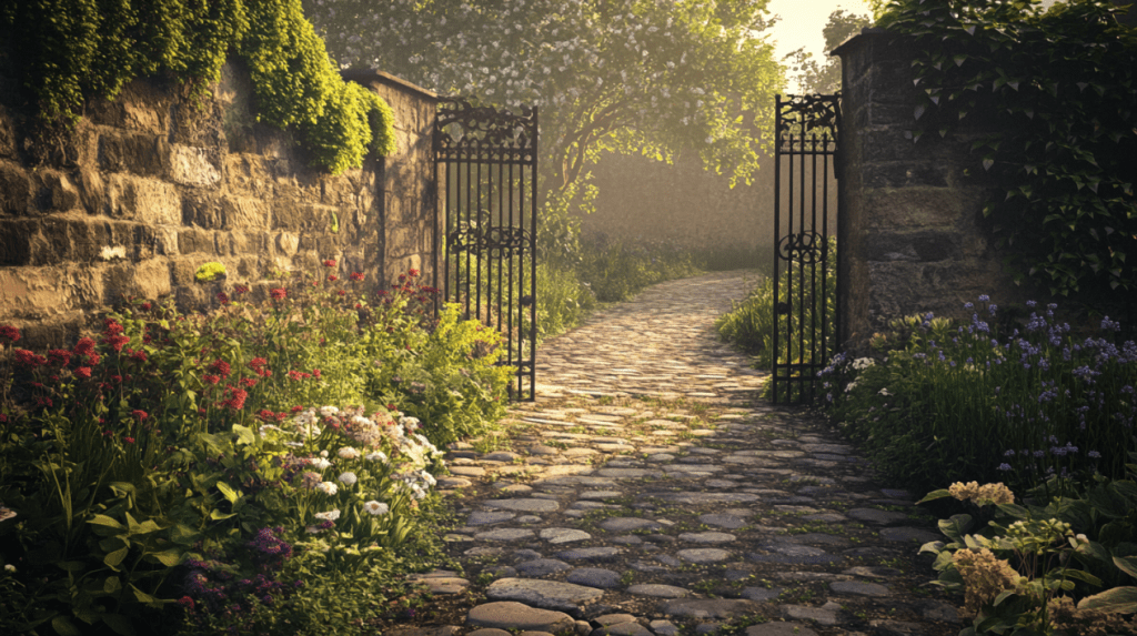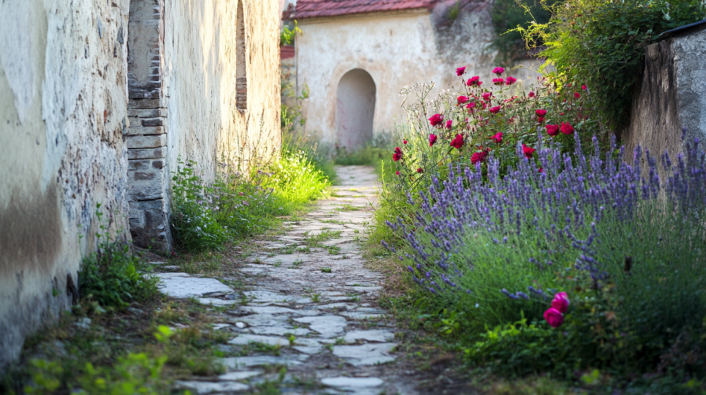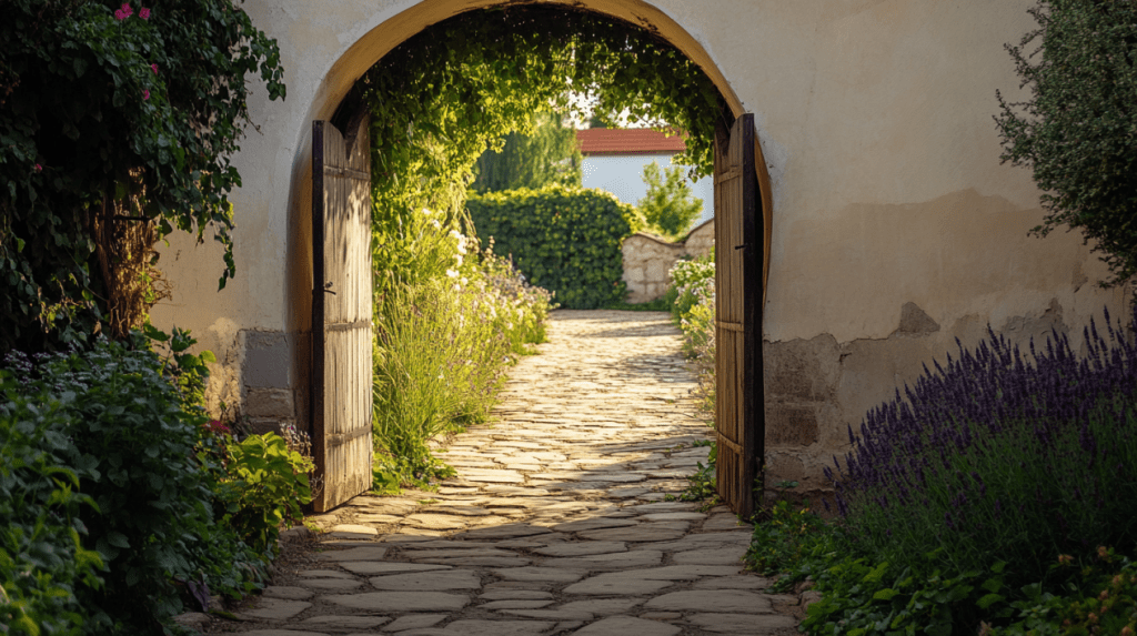 The wooden gate creaked softly as Elena pushed it open. A narrow stone path unfolded before them, framed by herbs and low flowers that seemed to have been growing there for decades without intervention—lavender, sage, a few untamed rose bushes. The air inside the walls felt stiller, yet gentler, as though sound had softened its edges out of reverence. A cat darted across the path and vanished into the shrubs. Somewhere nearby, a wind chime gave a muted chime.