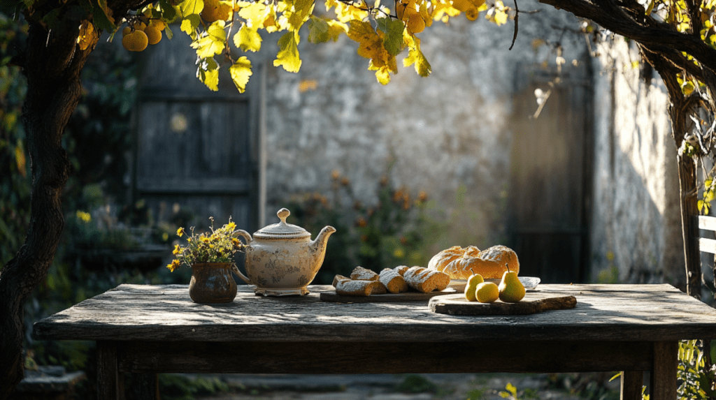 三人坐在老梨樹下,小桌上擺著幾個簡單的盤子和一壺陶製的熱茶。籃子裡有幾片切好的裸麥麵包,還有幾塊金黃微甜的手工糕點。蜜蜂在野花之間慢悠悠地飛,陽光穿過葡萄藤的葉子,在桌面上灑下斑駁光影。