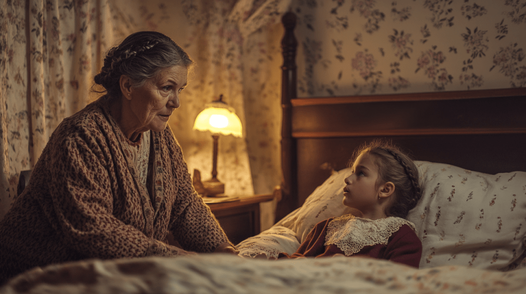 Alda 修女咬了一小口麵包,語氣倒像是說趣事似的:「睡前故事啊。有個奶奶,我記得她把聖經當童話講——沒有名字、沒有地點,只有精神。」